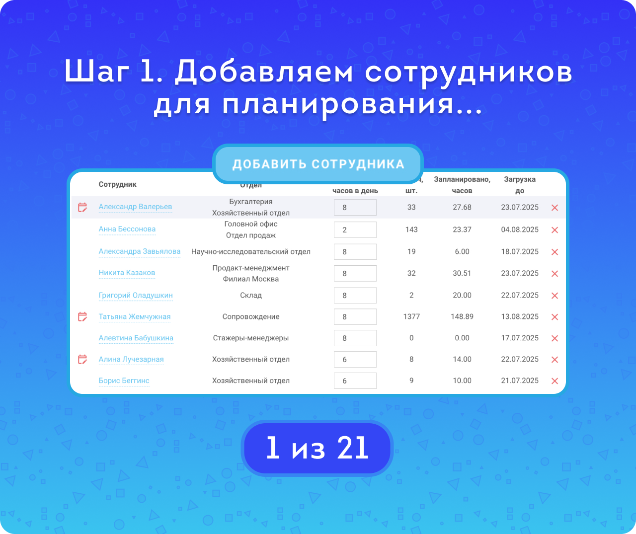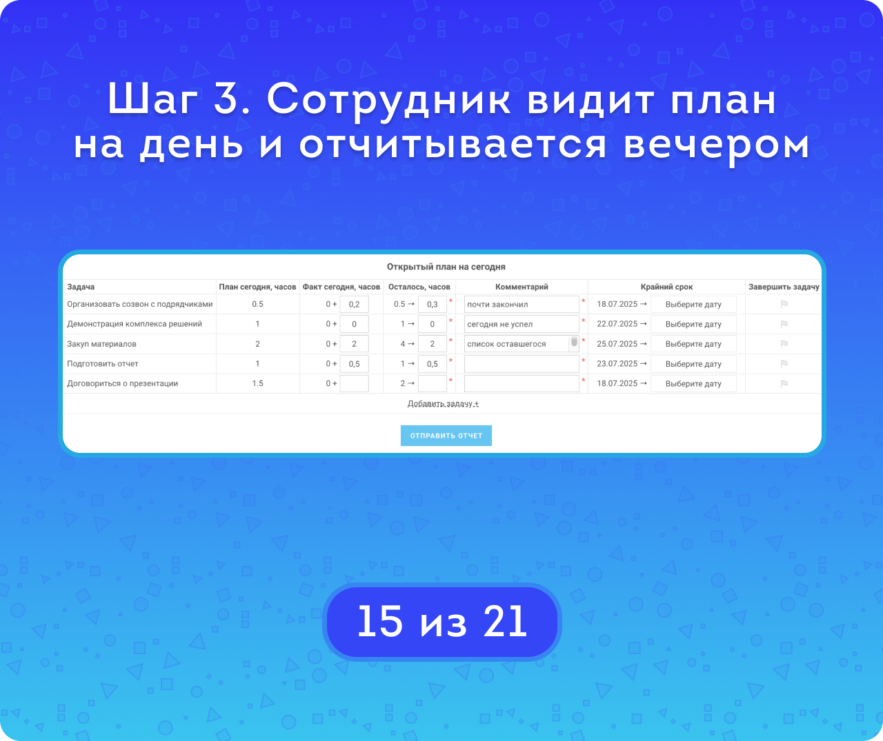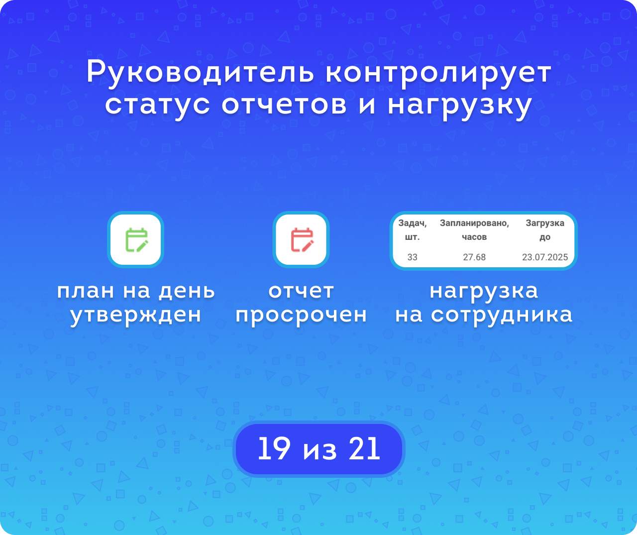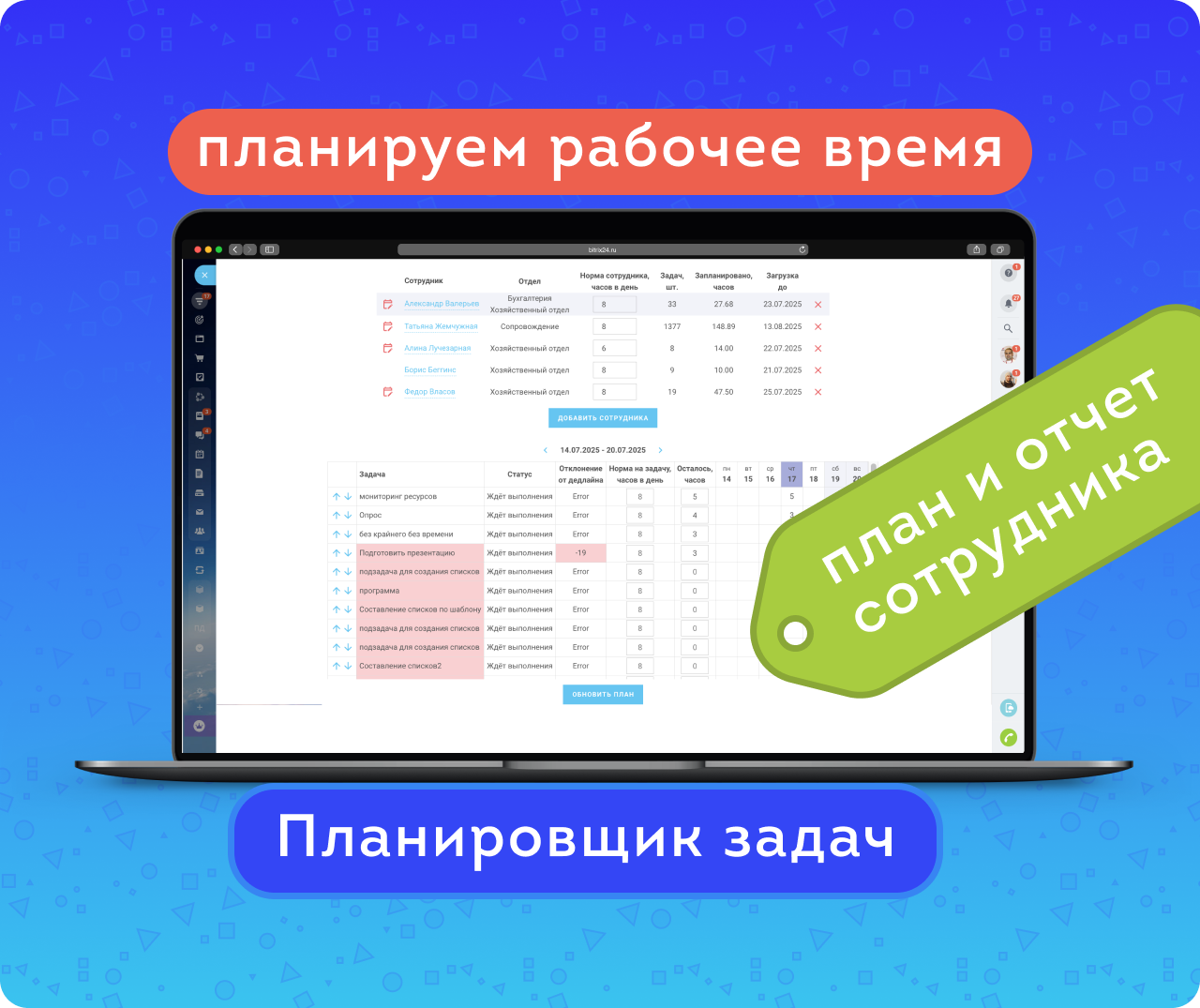 Планировщик задач — это не просто список дел, а полноценная система ежедневного управления рабочим временем и загрузкой команды. С его помощью руководители получают четкий контроль над загрузкой команды, а сотрудники — ясное понимание приоритетов и сроков.