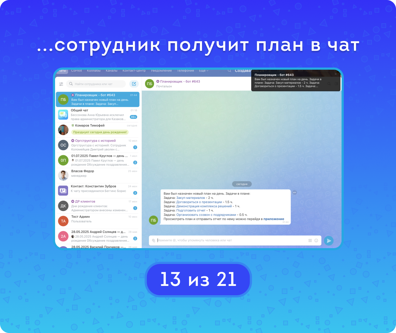 После составления плана руководитель сохраняет его (при этом всегда можно что-то поменять и нажать «Обновить план»). Затем чат-бот приложения отправляет сообщение сотруднику.