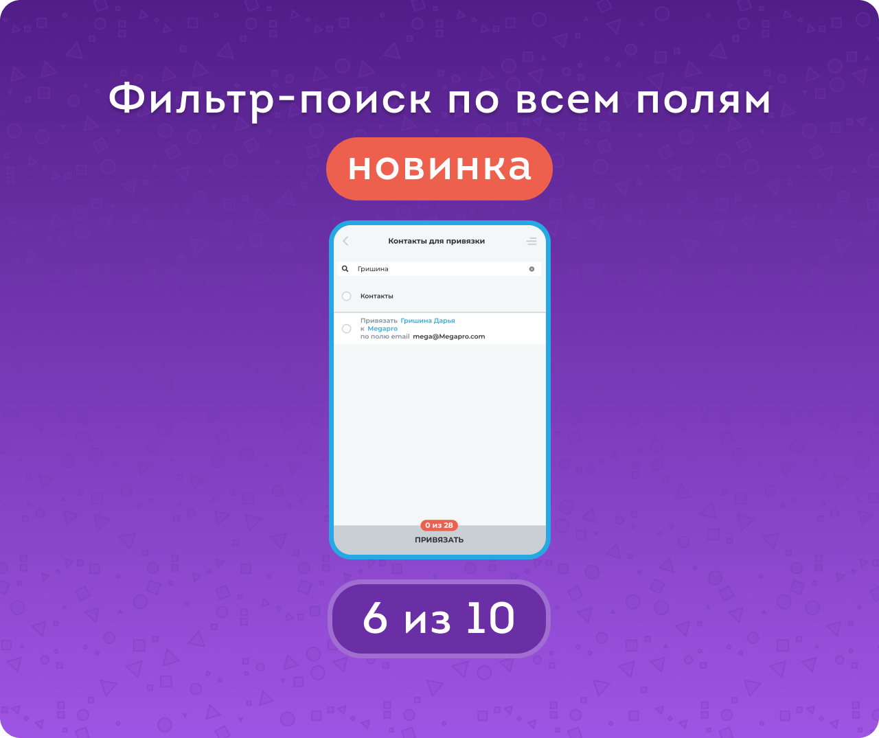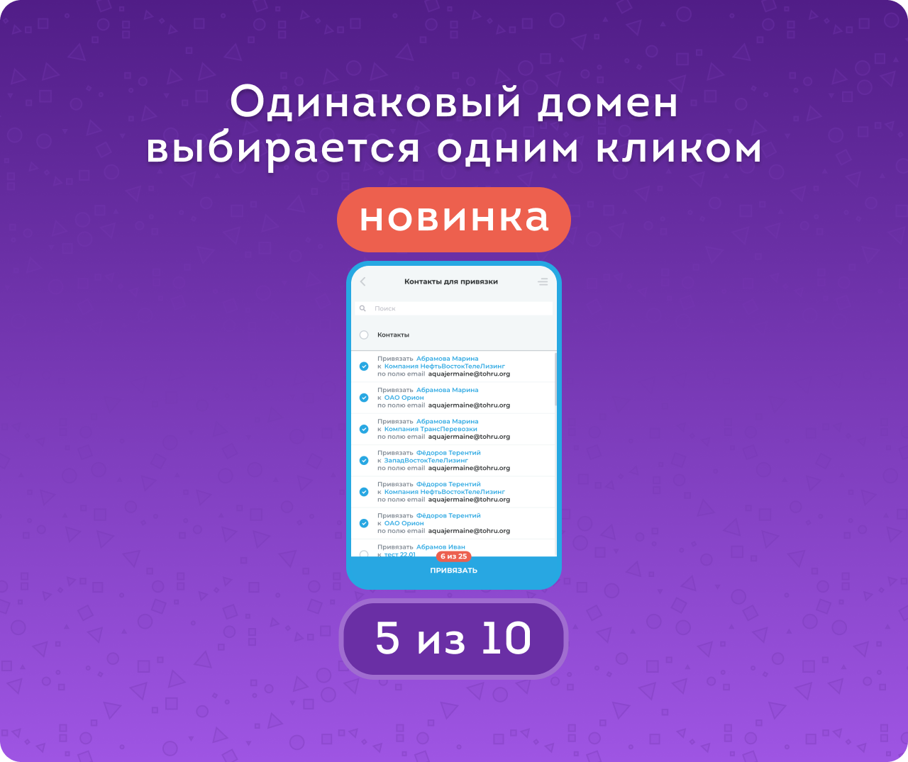 Групповой выбор одинаковых элементов (NEW) позволит одним кликом выбирать все контакты и компании с одинаковыми email и привязать их. Поиск по полям этих сущностей также упростит задачу.