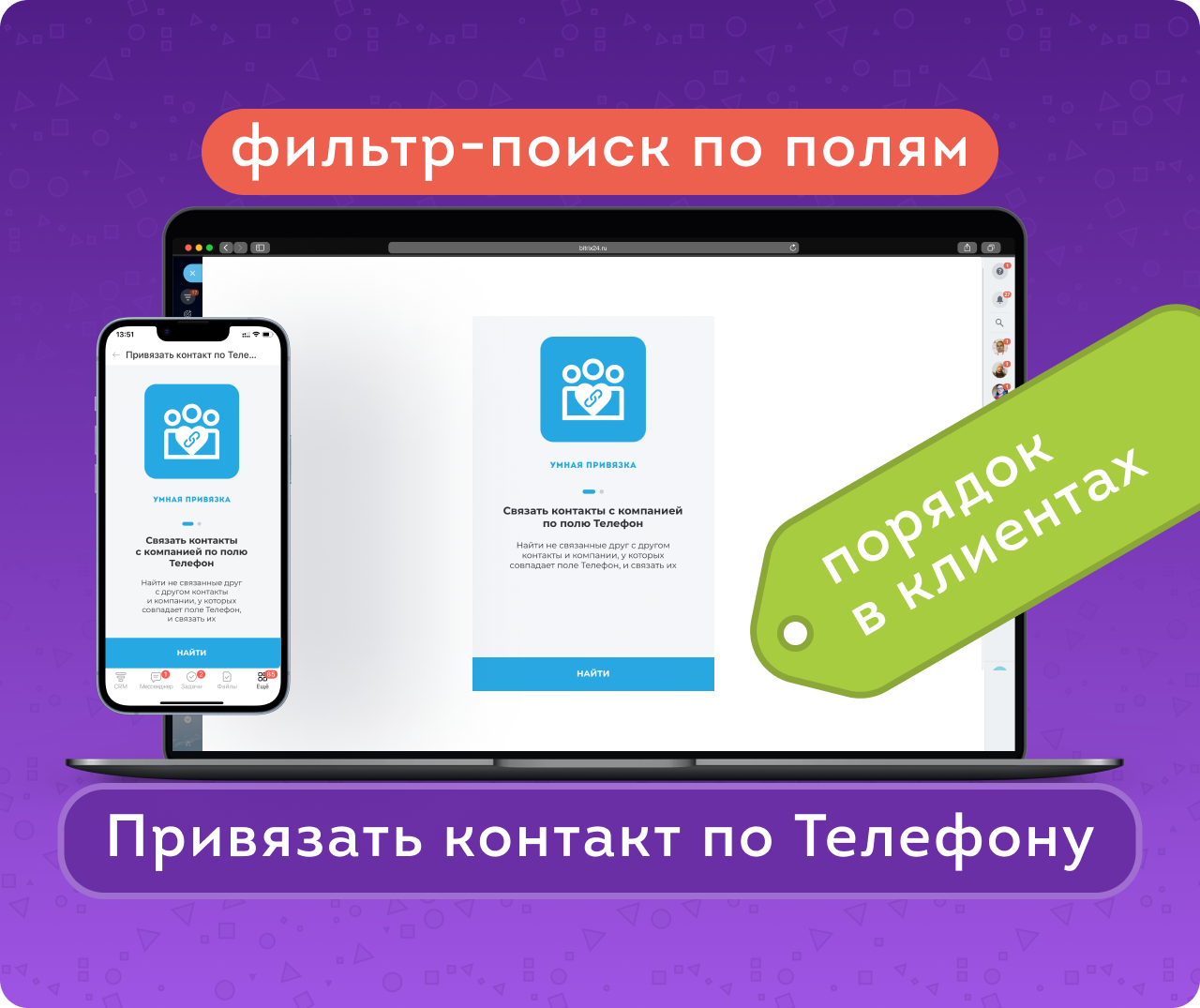Привязать контакт по Телефону — это приложение, которое поможет связать Контакты с нужными Компаниями. Является логическим продолжением решения Сегментация клиентов и частью комплекса Умная привязка контактов к компании. Разработано в рамках философии учебника «Клиенты в порядке».