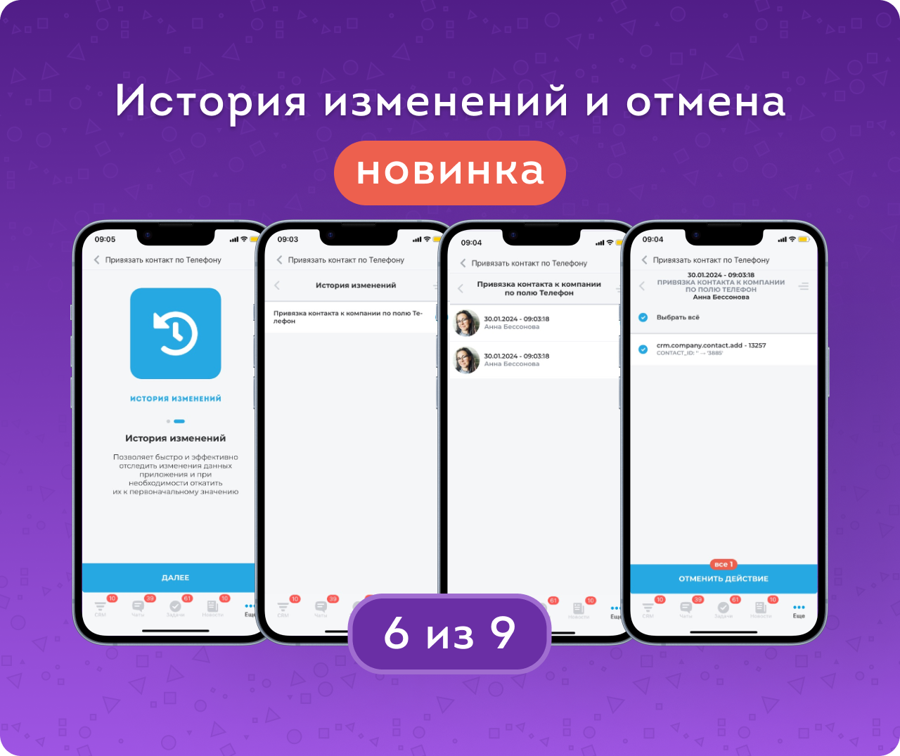 История изменений позволяет быстро и эффективно отследить изменение данных через приложение и при необходимости откатить их к первоначальному значению. В зависимости от прав доступа можно просмотреть, кто и когда привязывал контакты, а также отменить действие.