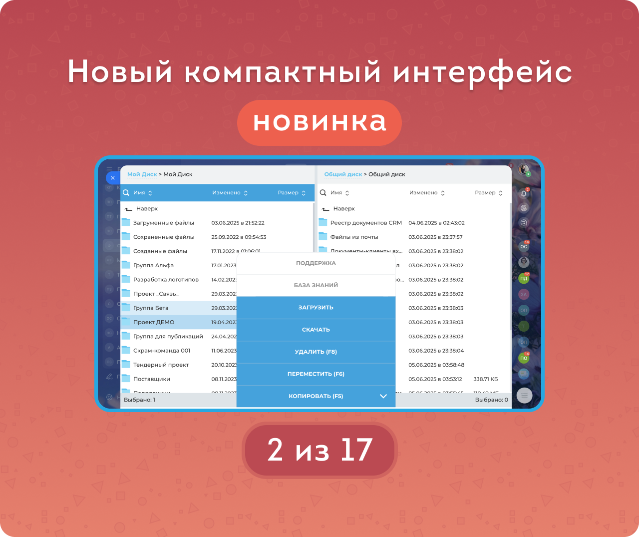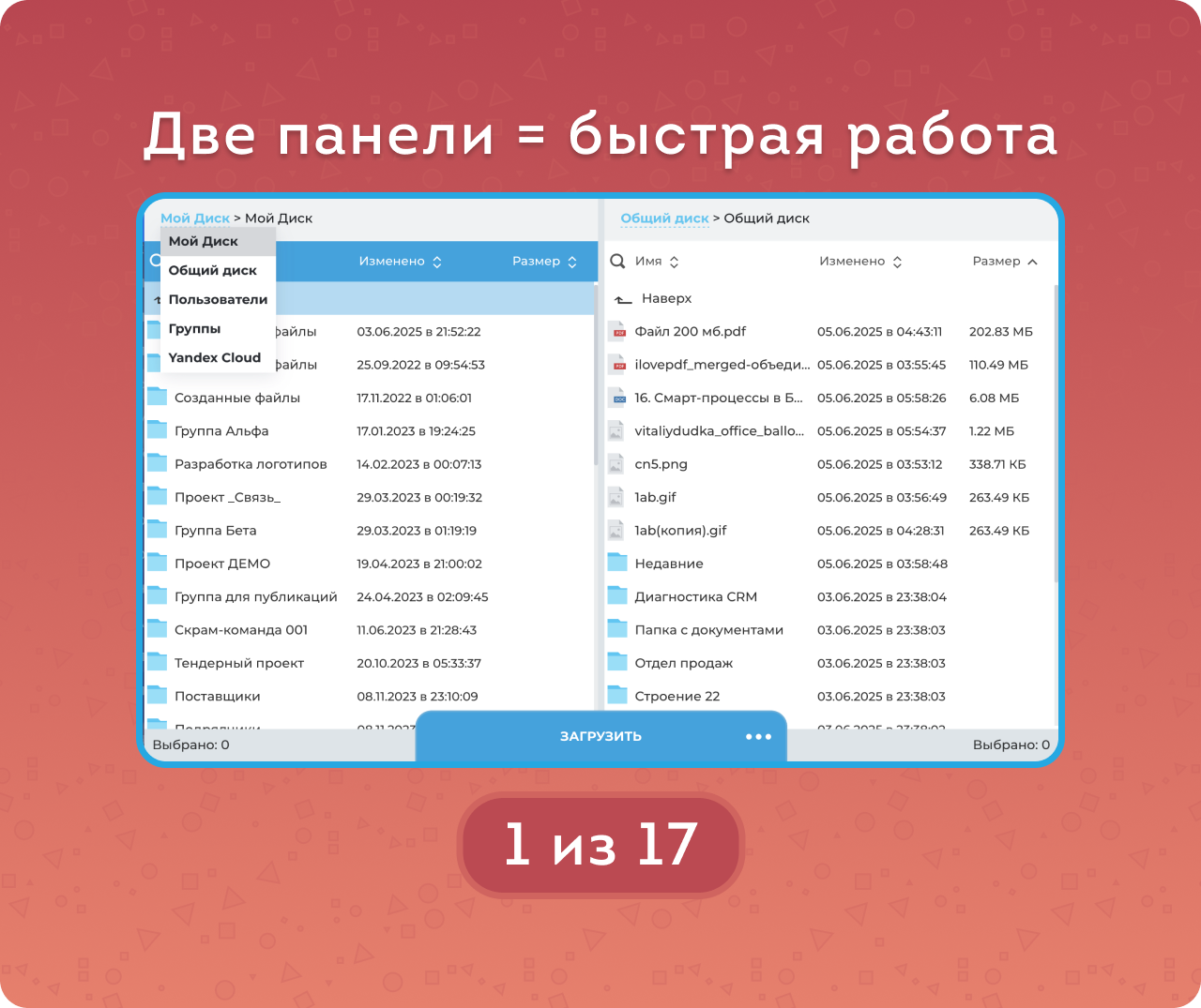 Приложение даёт возможность работать со всеми Дисками портала (Мой, Общий, Группы, Пользователи). Для удобства реализован двухпанельный интерфейс, привычный пользователям профессиональных файловых менеджеров.