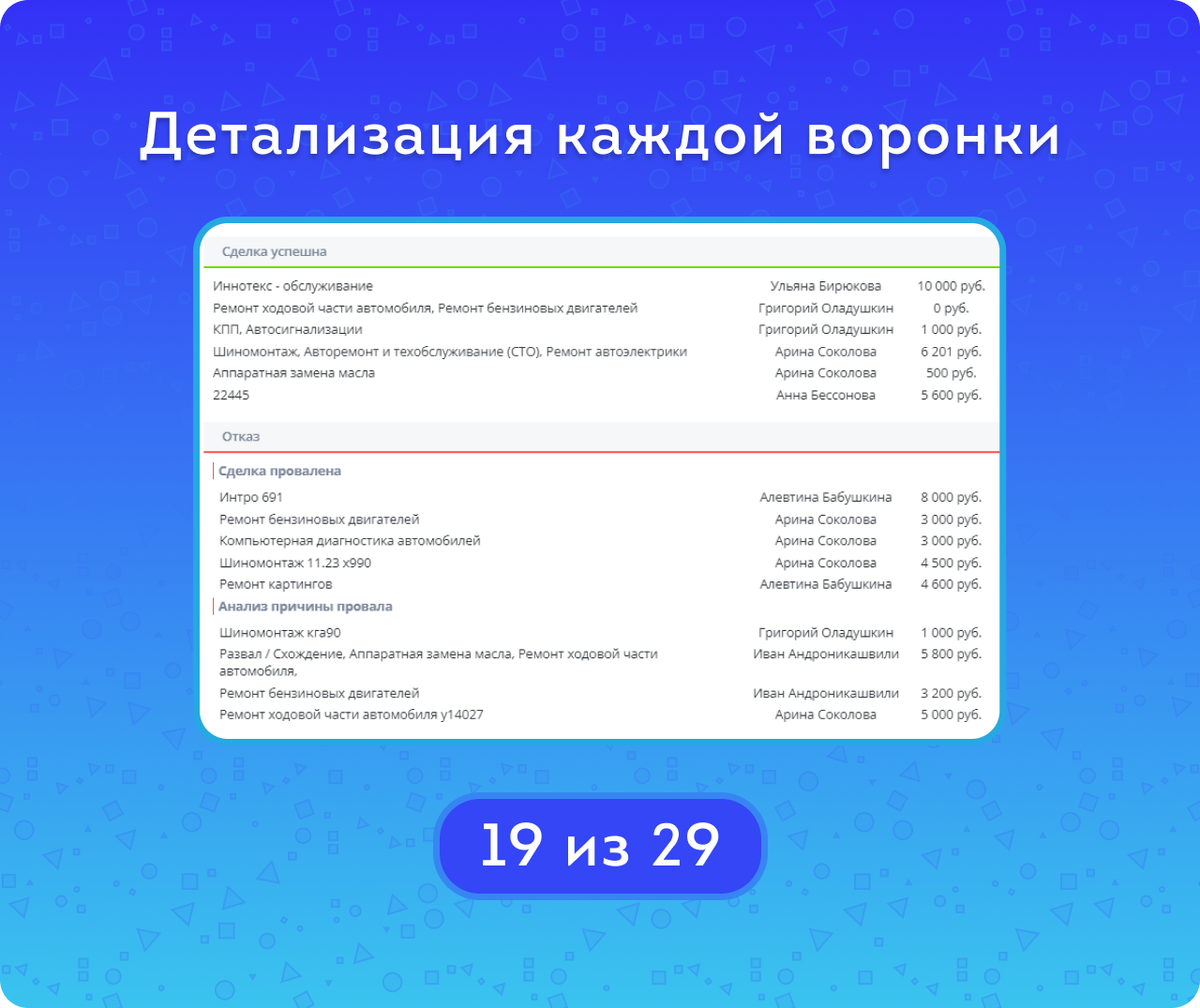 Если сделка находилась на стадии менее минуты, её длительность на ней будет нулевой — как и для успешных сделок, пропустивших какую-либо стадию. Кроме того, учитывается ситуация непоследовательного движения по стадиям. График позволяет выявить стадии с наибольшим количеством отказов и задержек, а также его можно скачать в хорошем качестве для печати.
