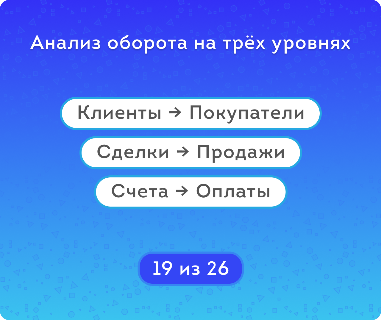 Оборот – это конечный результат работы системы продаж, на который влияют многие факторы. Формула продаж и ABC-анализ помогает понять, как формируется ваш Оборот по трем уровням: