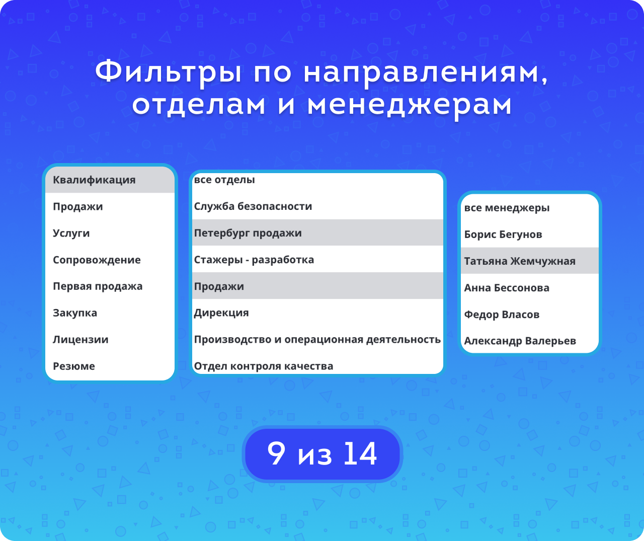 Кроме того, доступны фильтры по компаниям, отделам (можно выбрать несколько) и менеджерам. Это удобно для сравнения эффективности подразделений или сотрудников.