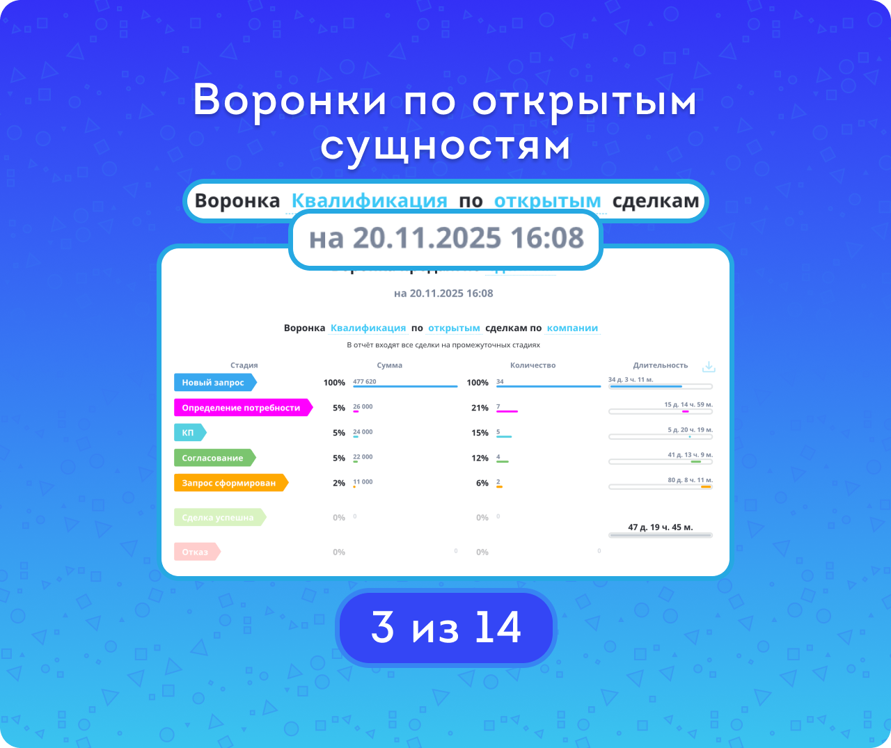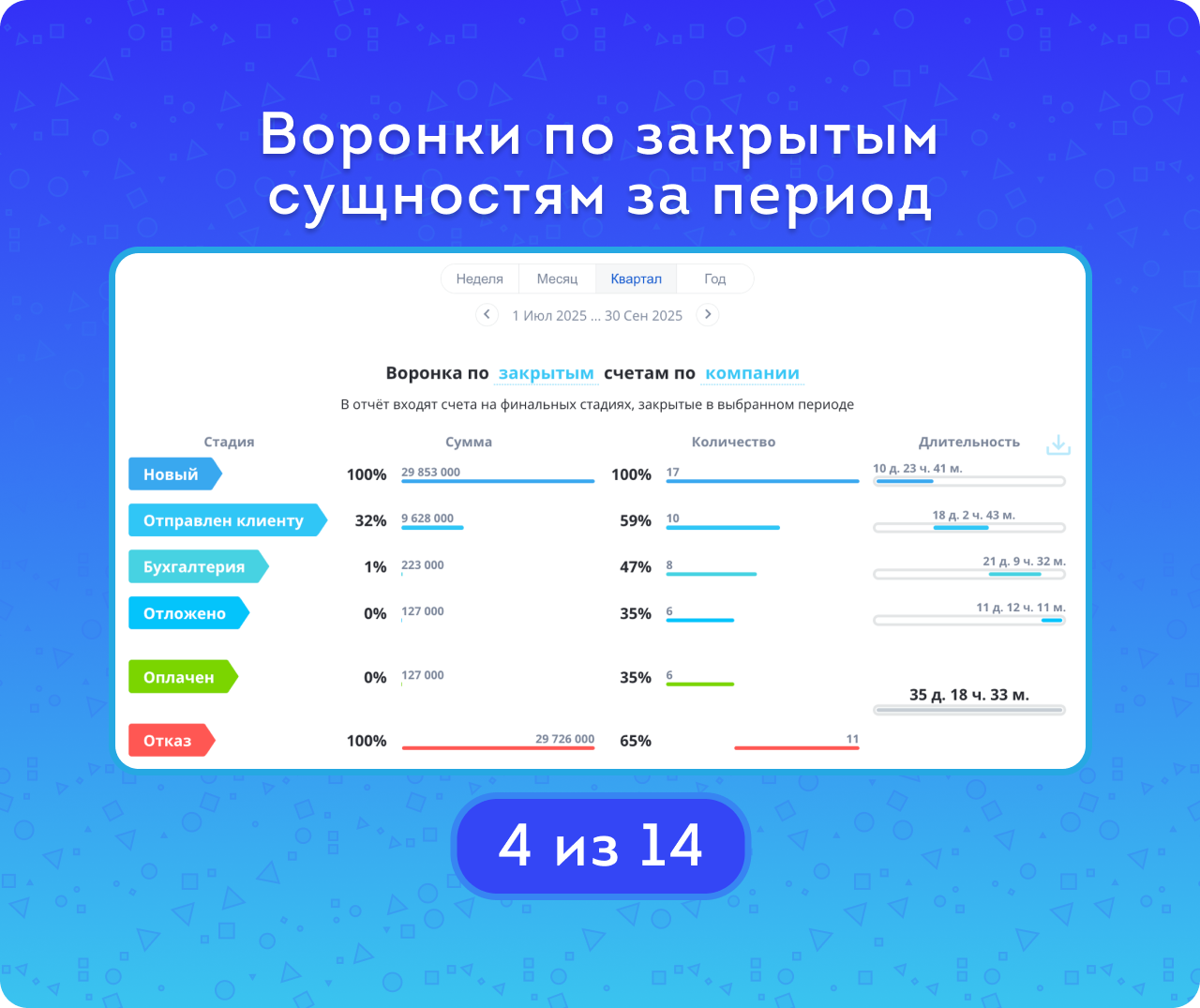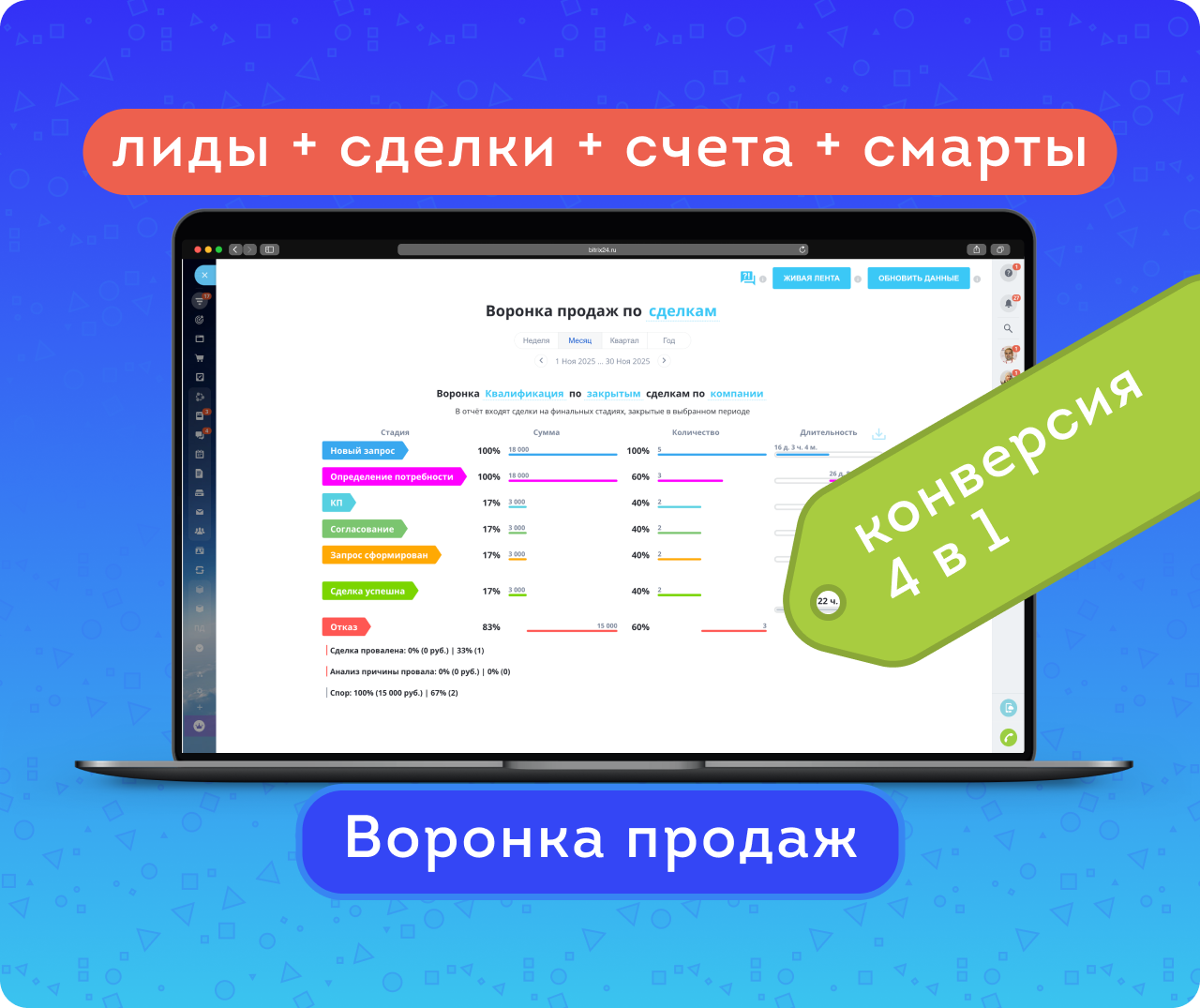 — 26.11.2025: Теперь Воронка продаж — это комплексное решение, которое анализирует сразу четыре сущности: Лиды, Сделки, Счета и Смарт-процессы. Мы также добавили новый период для анализа - «квартал».