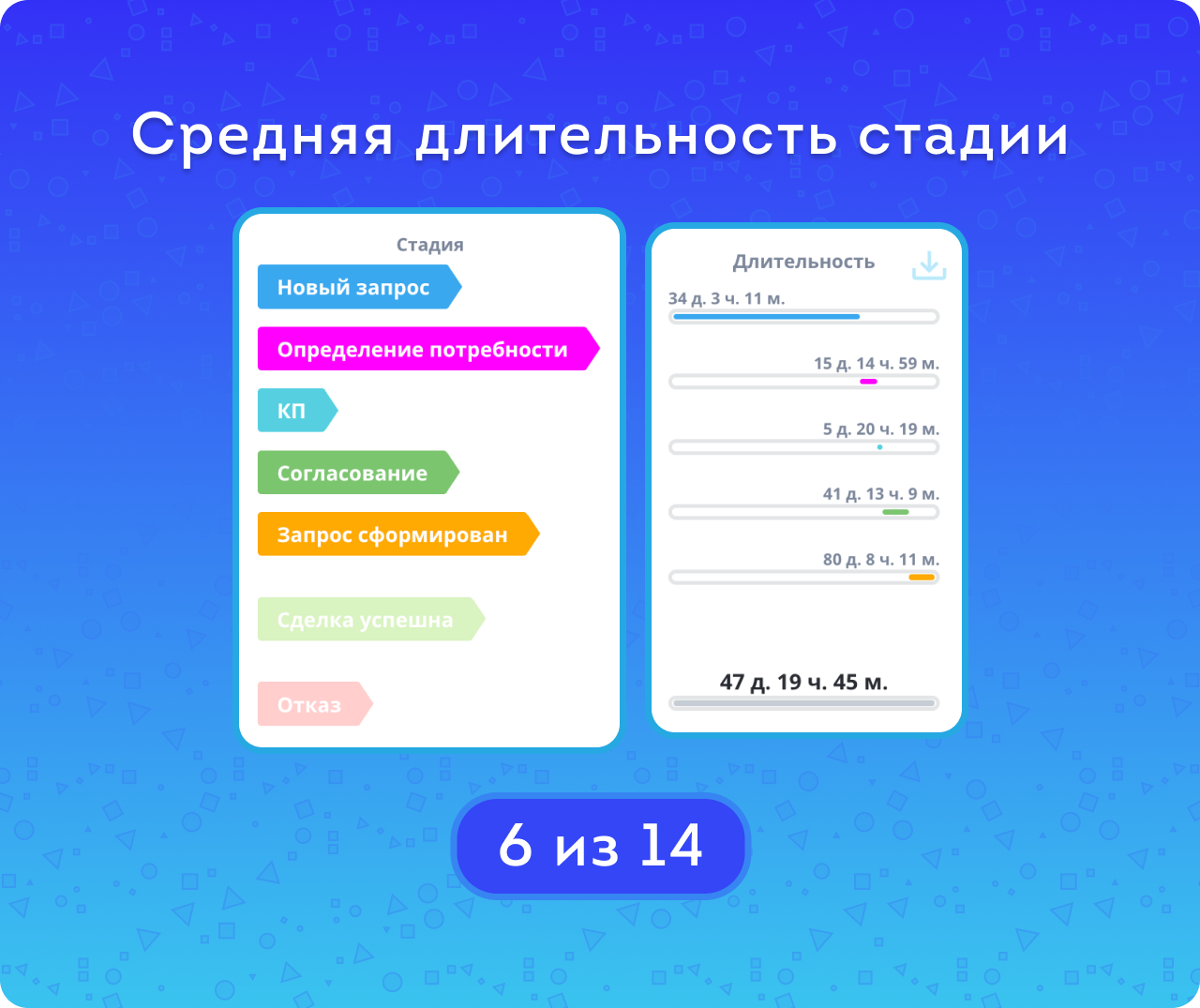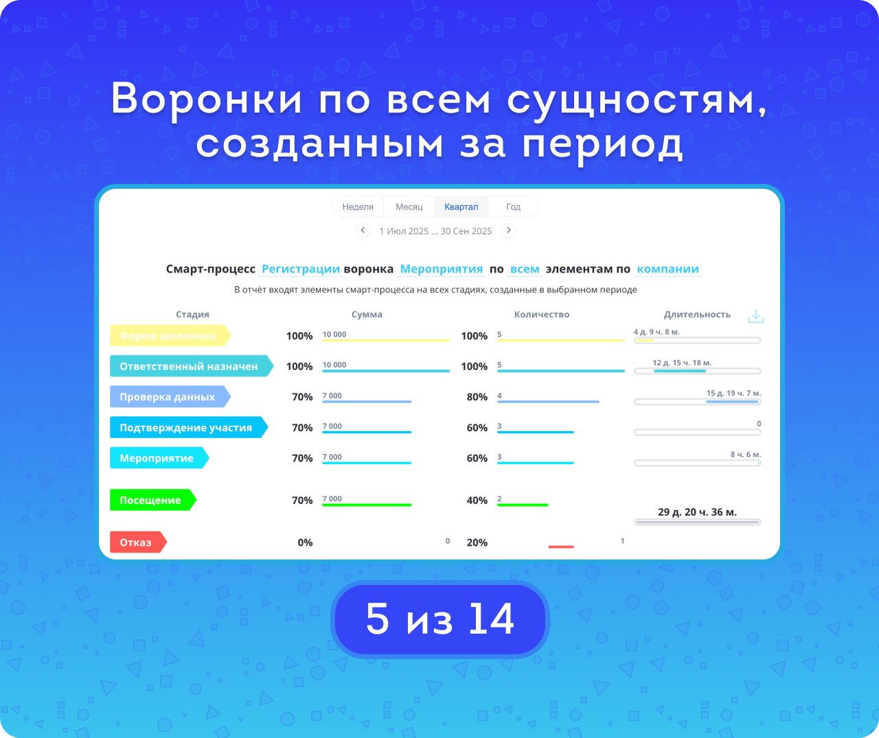 увидеть, на каких стадиях «застревают» сделки, лиды, счета или смарт-процессы;