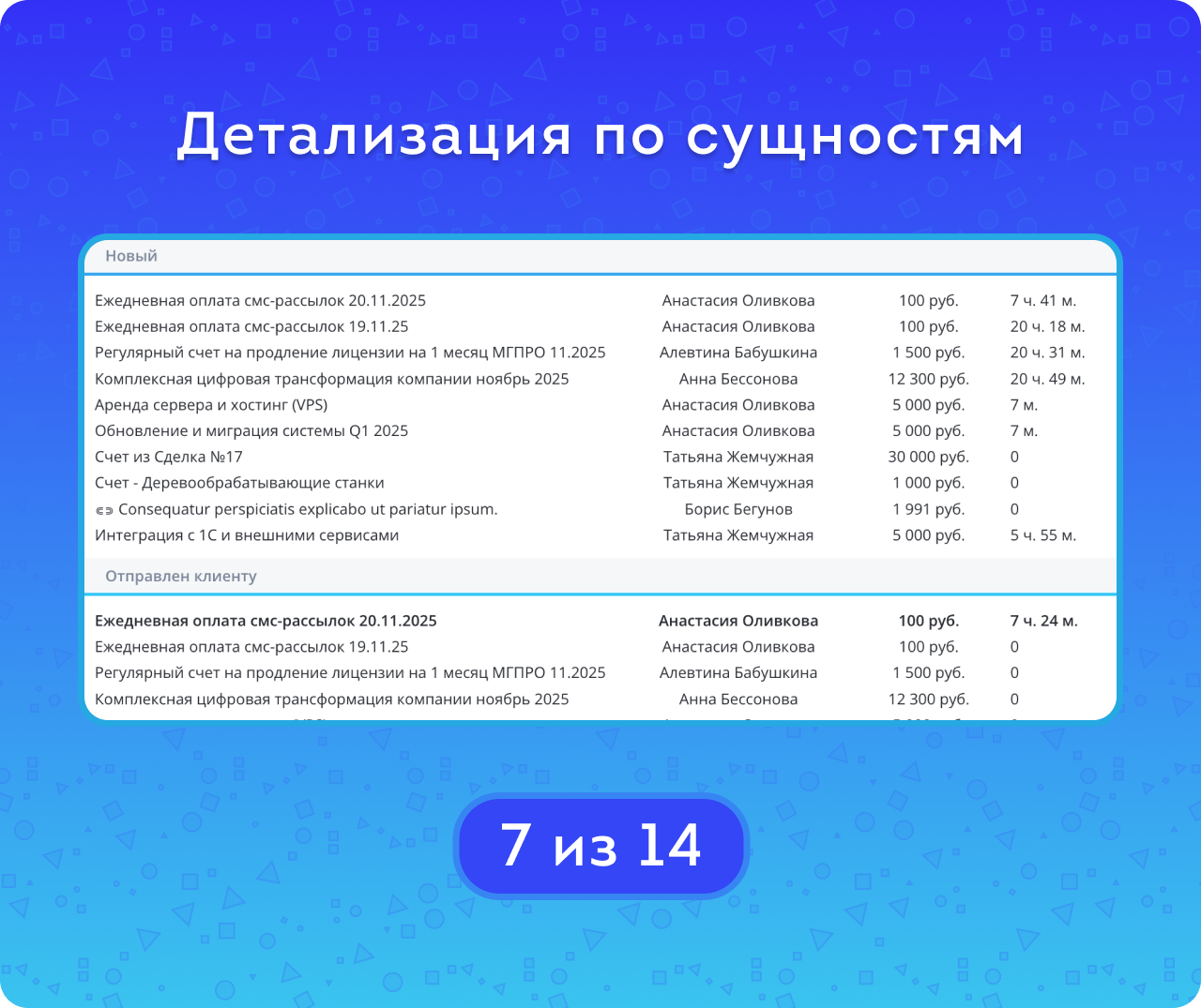 Закрытые сущности — те, что закрыты за период. Счета учитываются по полю Срок оплаты, а лиды, сделки и смарт-процессы по Дате завершения.