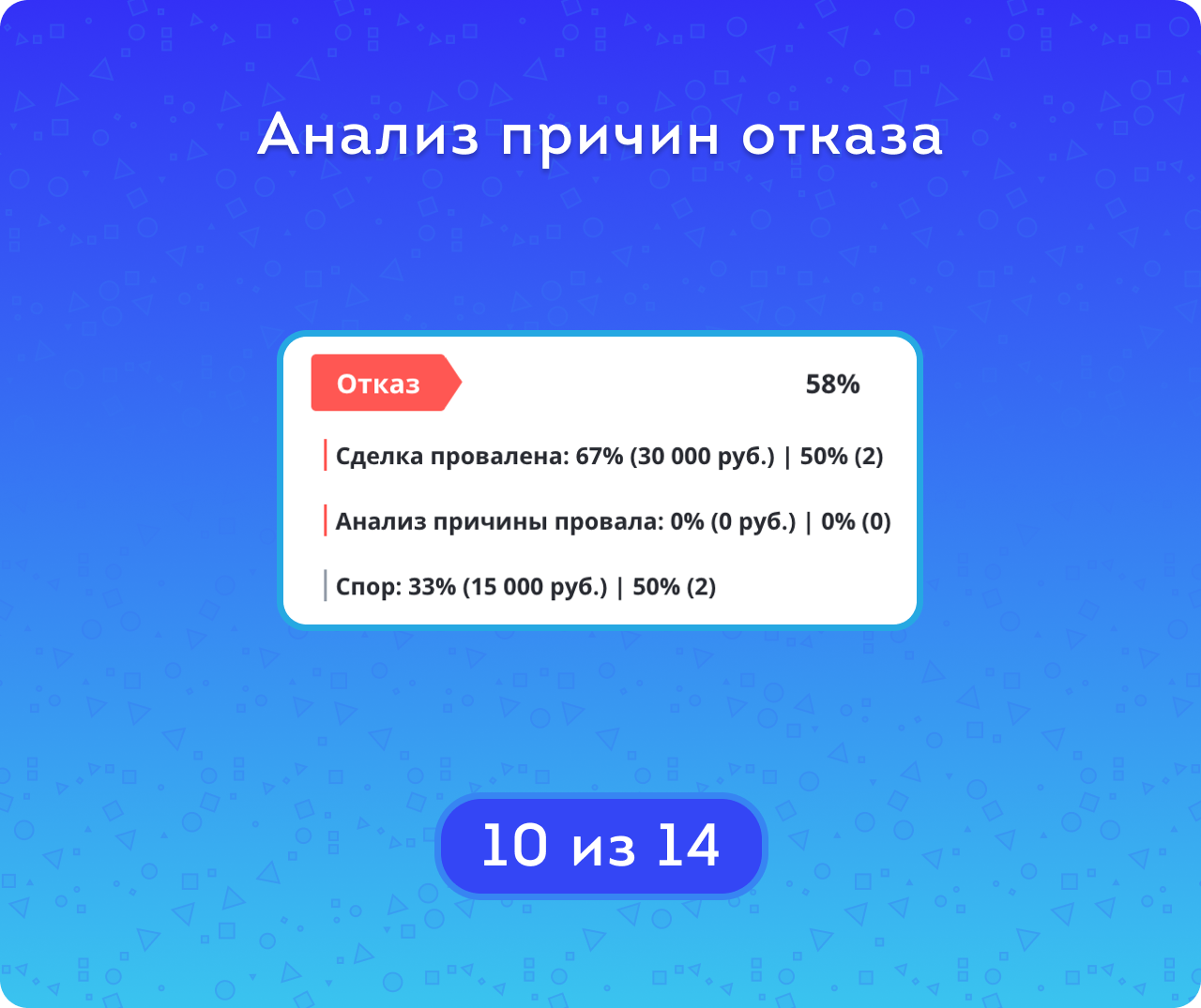 Помимо общих показателей по сумме, количеству и конверсии отказа, вы можете более подробно изучить причины неудач для разных провальных стадий, и улучшить эффективность продаж.