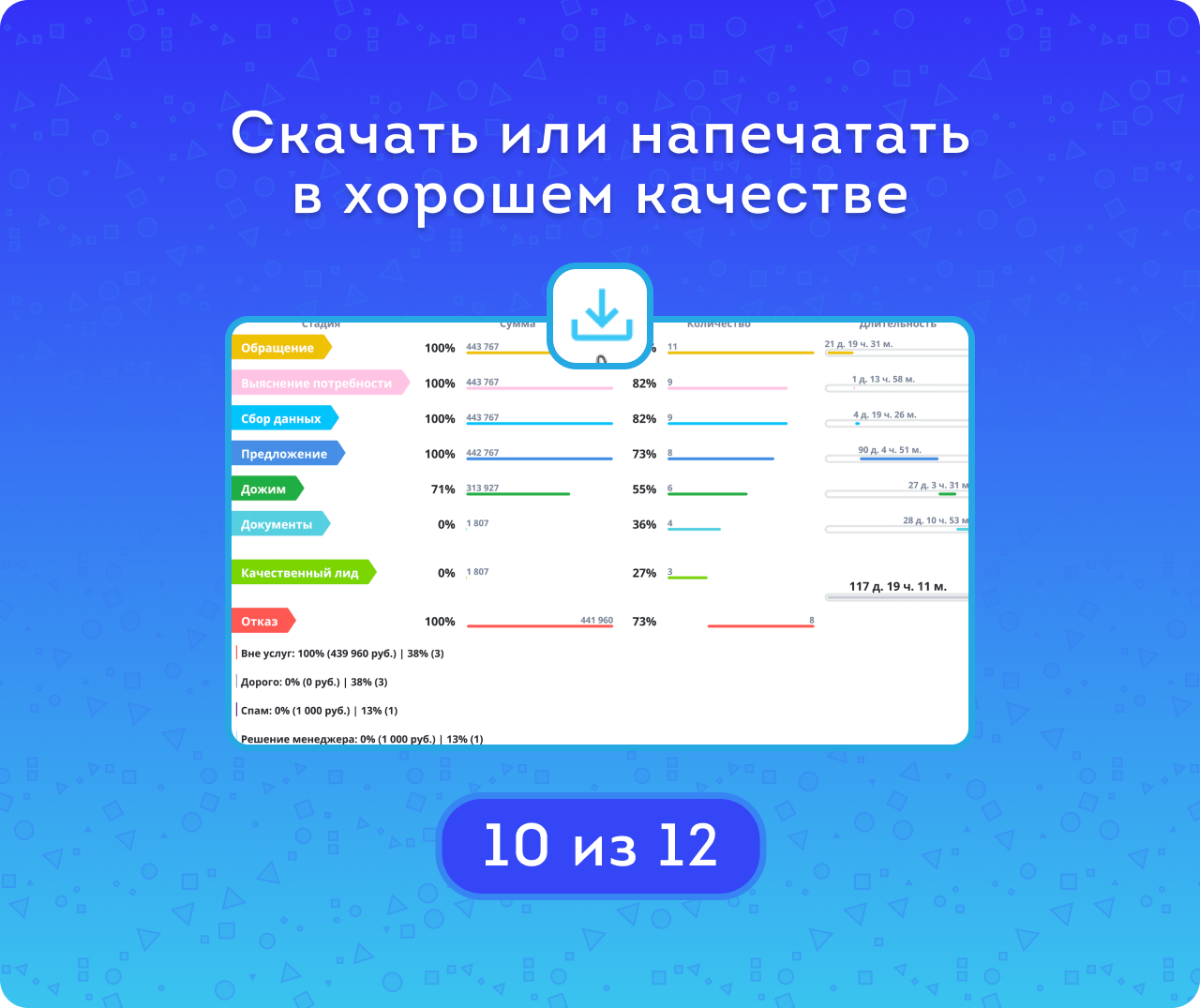 Если лид находился на стадии менее минуты, его длительность на ней будет нулевой — как и для успешных лидов, пропустивших какую-либо стадию. Кроме того, учитывается ситуация непоследовательного движения по стадиям. График позволяет выявить стадии с наибольшим количеством отказов и задержек, а также его можно скачать в хорошем качестве для печати.