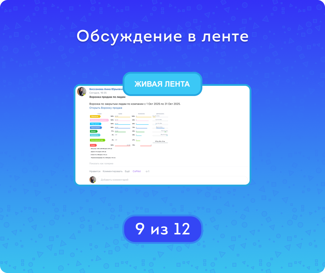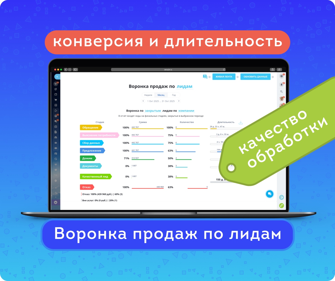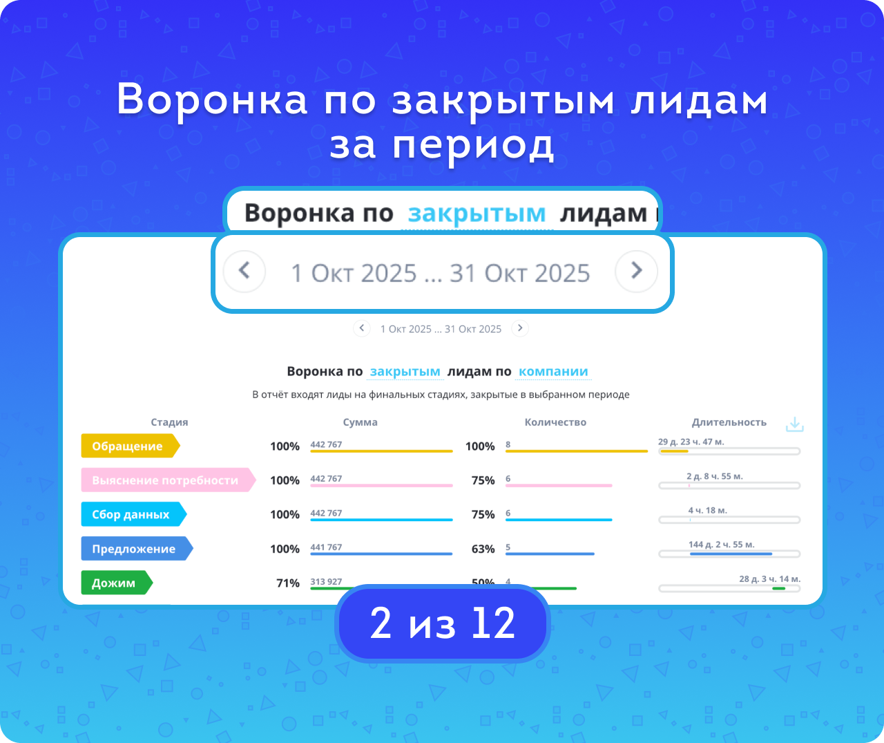 Воронка продаж по лидам — поможет увидеть весь путь потенциального клиента, с момента первого контакта до закрытия. Решение анализирует конверсию и длительность, чтобы выявить слабые и сильные места в процессе продаж. Является частью комплекса Формула продаж и ABC-анализ.