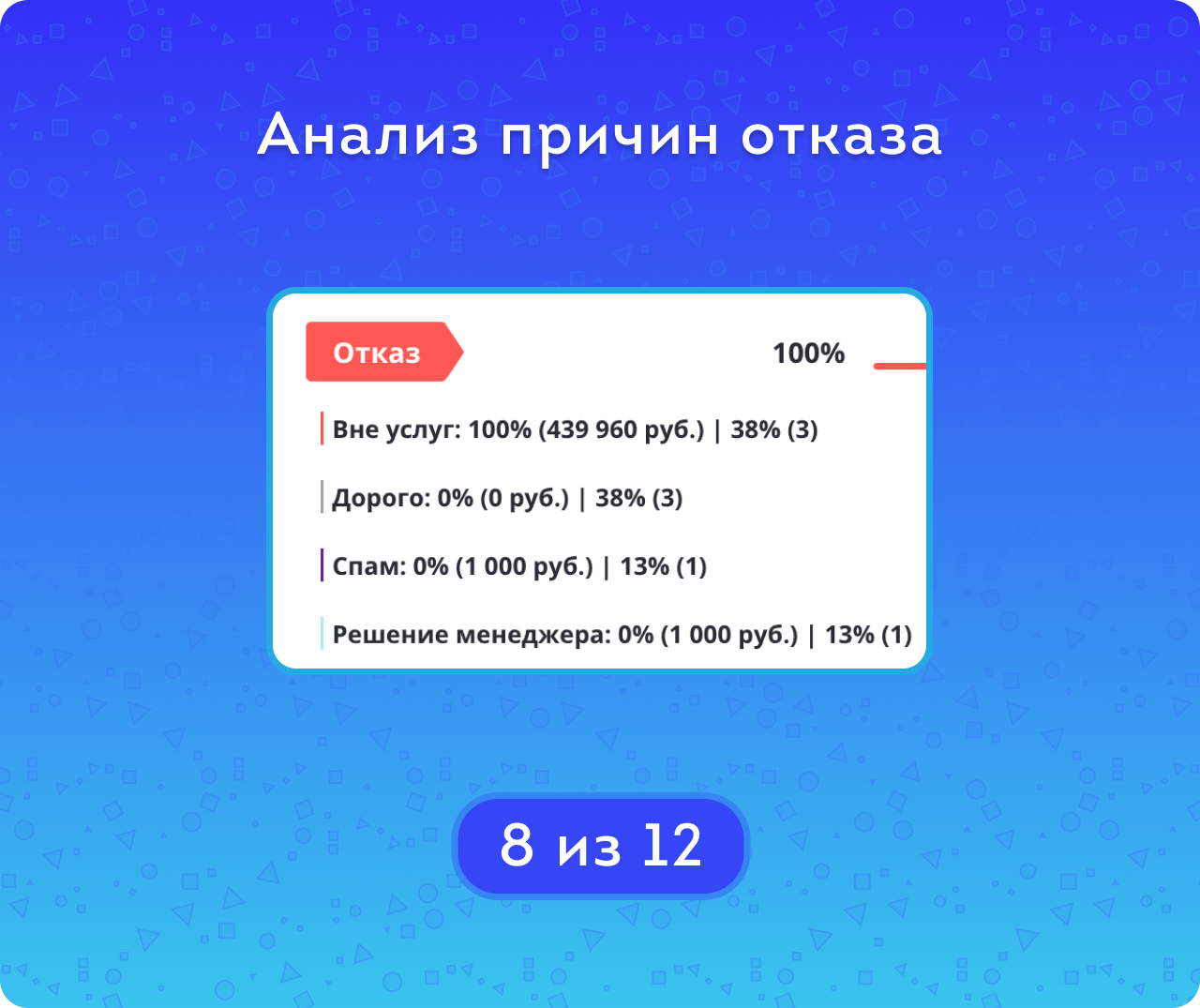 Помимо общих показателей по сумме, количеству и конверсии отказа, вы можете более подробно изучить причины неудач для разных провальных стадий. А если нужно построить отчет по другим полям, либо в связке со сделками/счетами — воспользуйтесь Мастером отчетов CRM.
