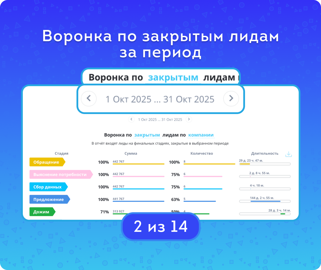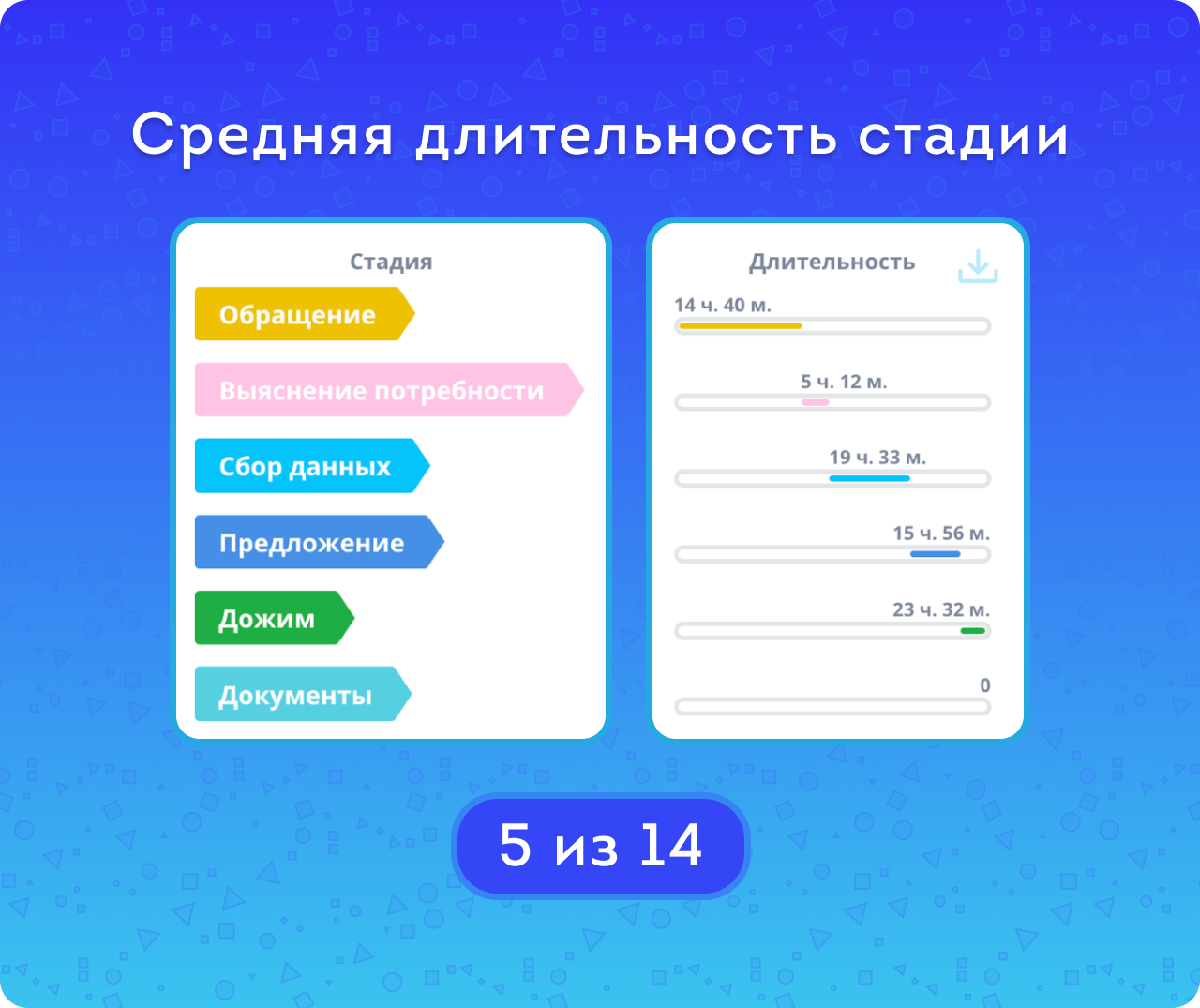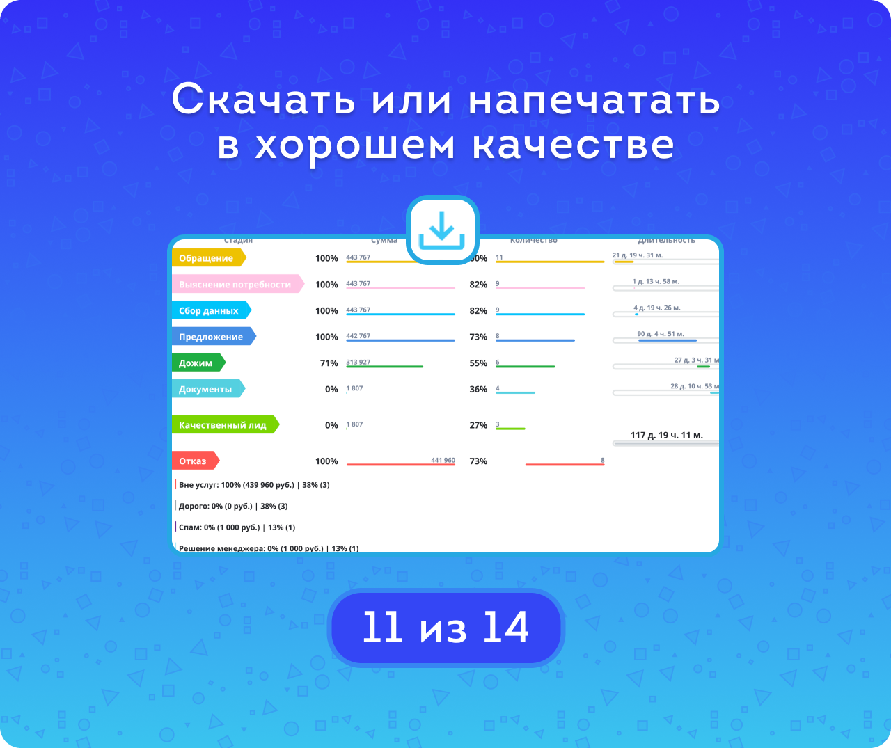 Если лид находился на стадии менее минуты, его длительность на ней будет нулевой — как и для успешных лидов, пропустивших какую-либо стадию. Кроме того, учитывается ситуация непоследовательного движения по стадиям. График позволяет выявить стадии с наибольшим количеством отказов и задержек, а также его можно скачать в хорошем качестве для печати.