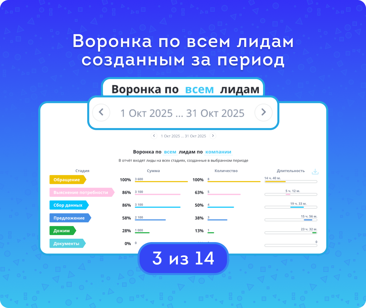 Воронка продаж по Лидам — поможет увидеть весь путь потенциального клиента, с момента первого контакта до закрытия. Решение анализирует конверсию и длительность, чтобы выявить слабые и сильные места в процессе продаж. Является частью комплекса Формула продаж и ABC-анализ.