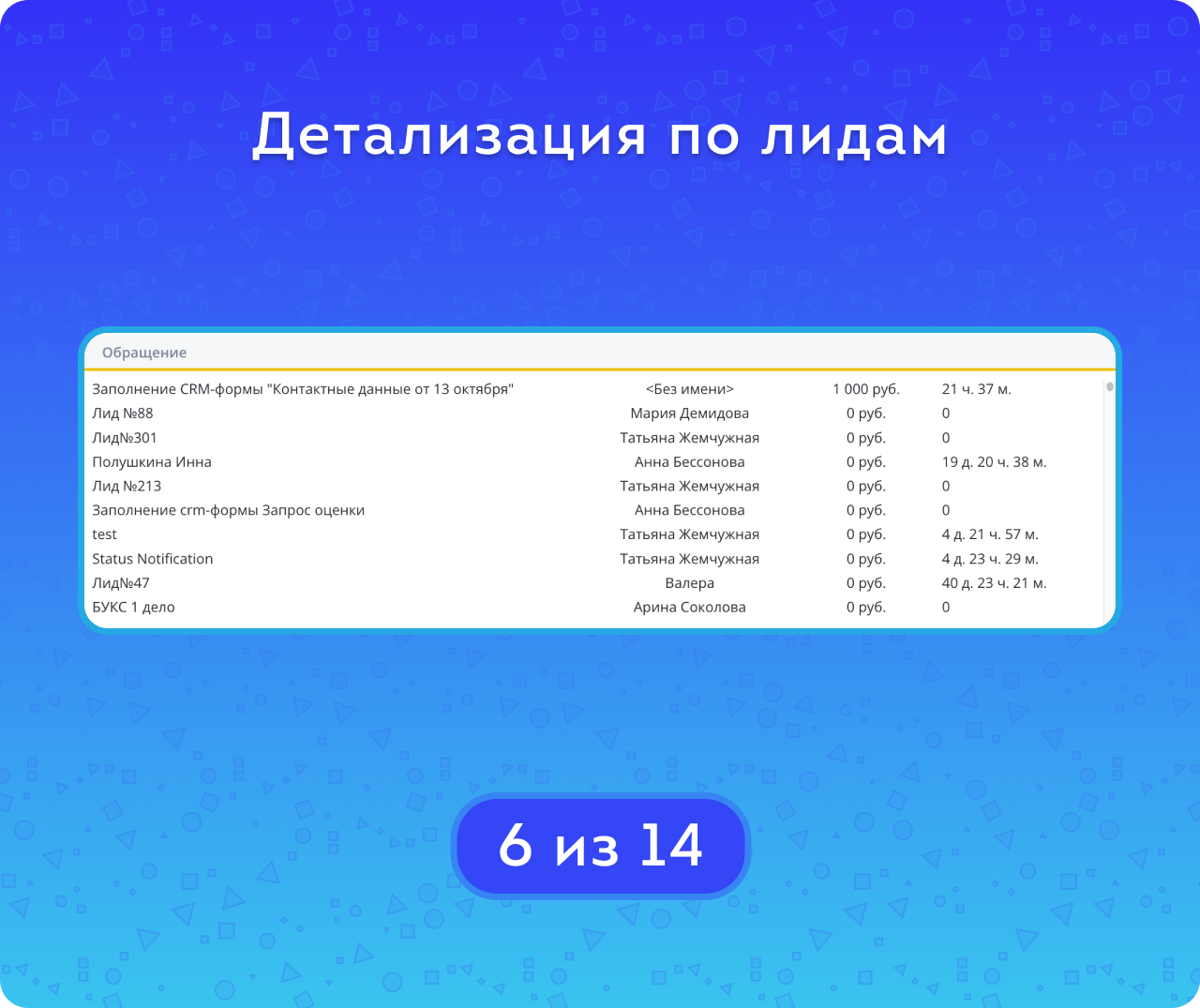 Под графиком находится таблица с детализацией лидов по стадиям — для того, чтобы можно было убедиться в достоверности расчетов. В ней указаны: название каждого лида, ответственный за него, сумма и время нахождения на конкретной стадии. Те лиды, которые в настоящий момент находятся на стадии – выделены жирным шрифтом.