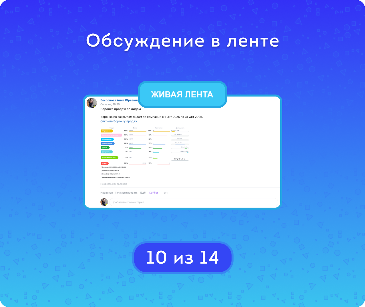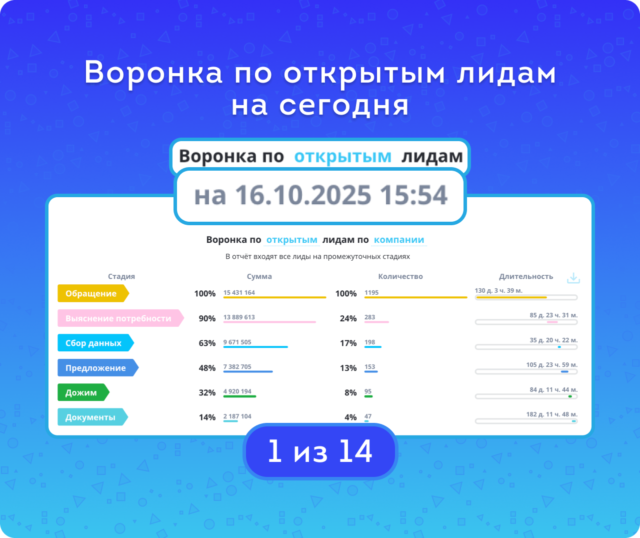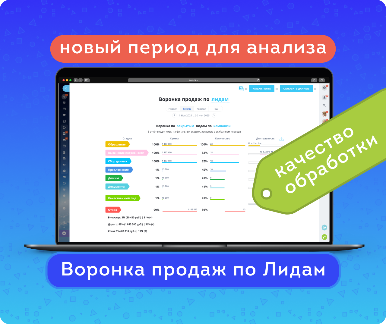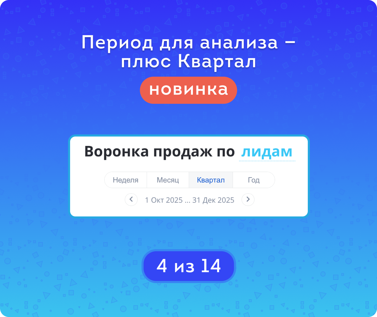 В комплексной Воронке продаж для анализа доступны не только лиды, но и сделки, счета и смарт-процессы. Это даёт сквозную картину движения клиента и полный контроль над точками роста. Кроме того, вам может быть полезен учебник Формула продаж – он доступен по ссылке. Анонсы новых версий, видео и помощь с приложением — в официальном телеграм-канале.