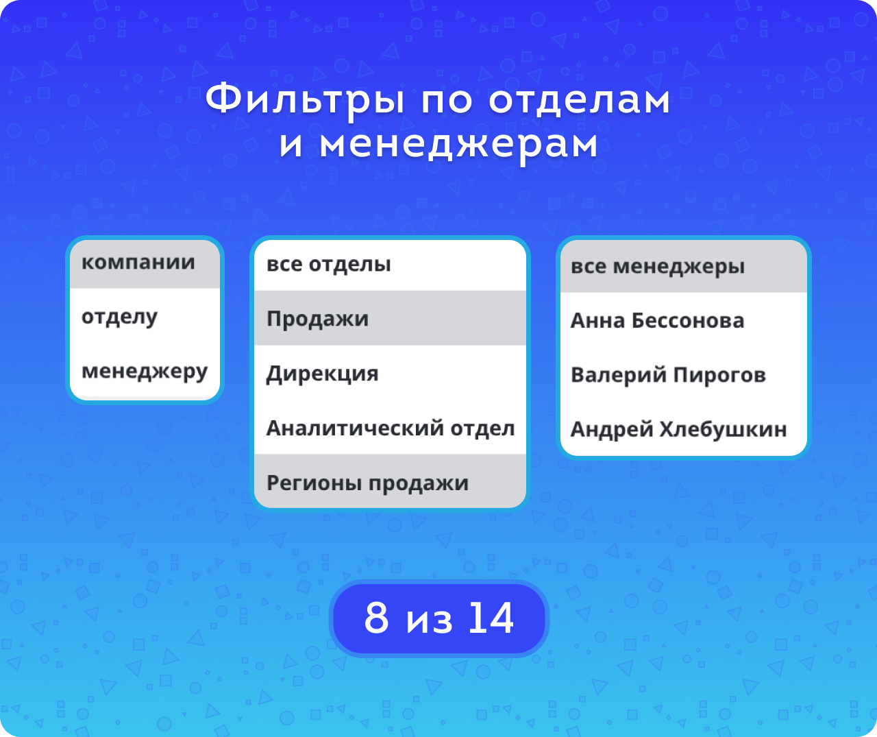 Открытые лиды отображаются по состоянию на текущий день и время. А для закрытых и «всех» лидов можно выбрать период: неделя, месяц, квартал (NEW) или год. Кроме того, доступны фильтры по компаниям, отделам (можно выбрать несколько) и менеджерам. Это удобно для сравнения эффективности подразделений или сотрудников.