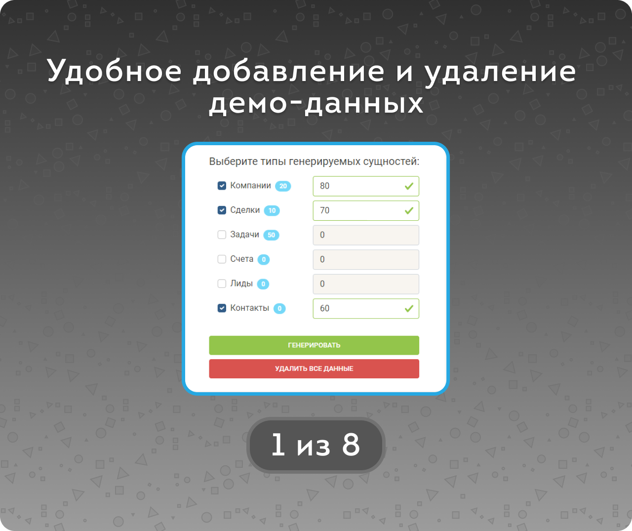 Генератор данных CRM поможет интеграторам Битрикс24 не тратить время на наполнение CRM или импорт тестовых баз. А после проведения обучения, демонстрации функционала CRM или тестирования порталов — все демо-данные можно удалить в один клик.