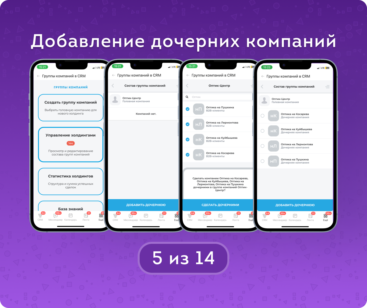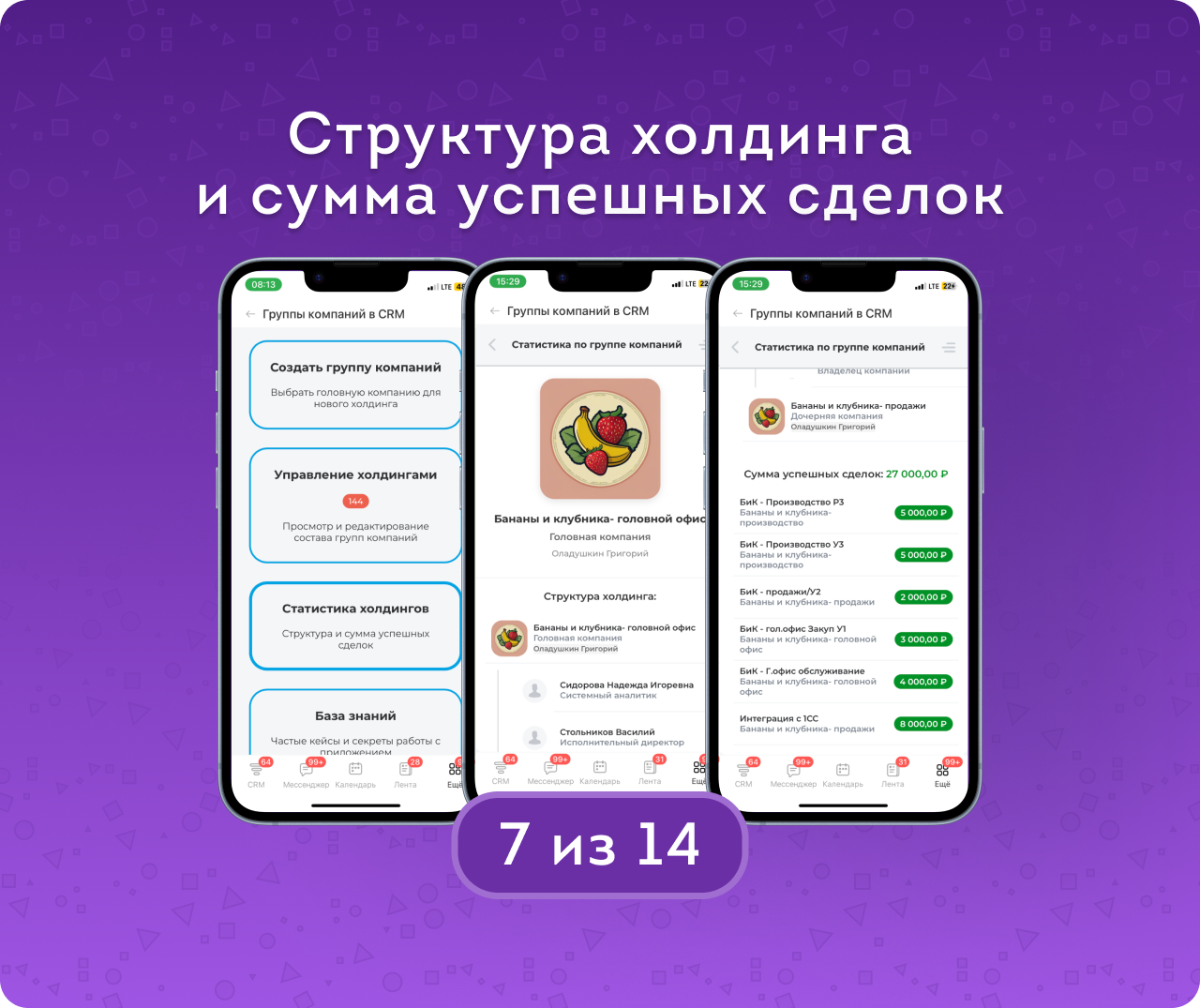 — Просматривать иерархию компаний в режиме «Статистика холдингов», где отображается полная структура и сумма успешных сделок по всему холдингу.