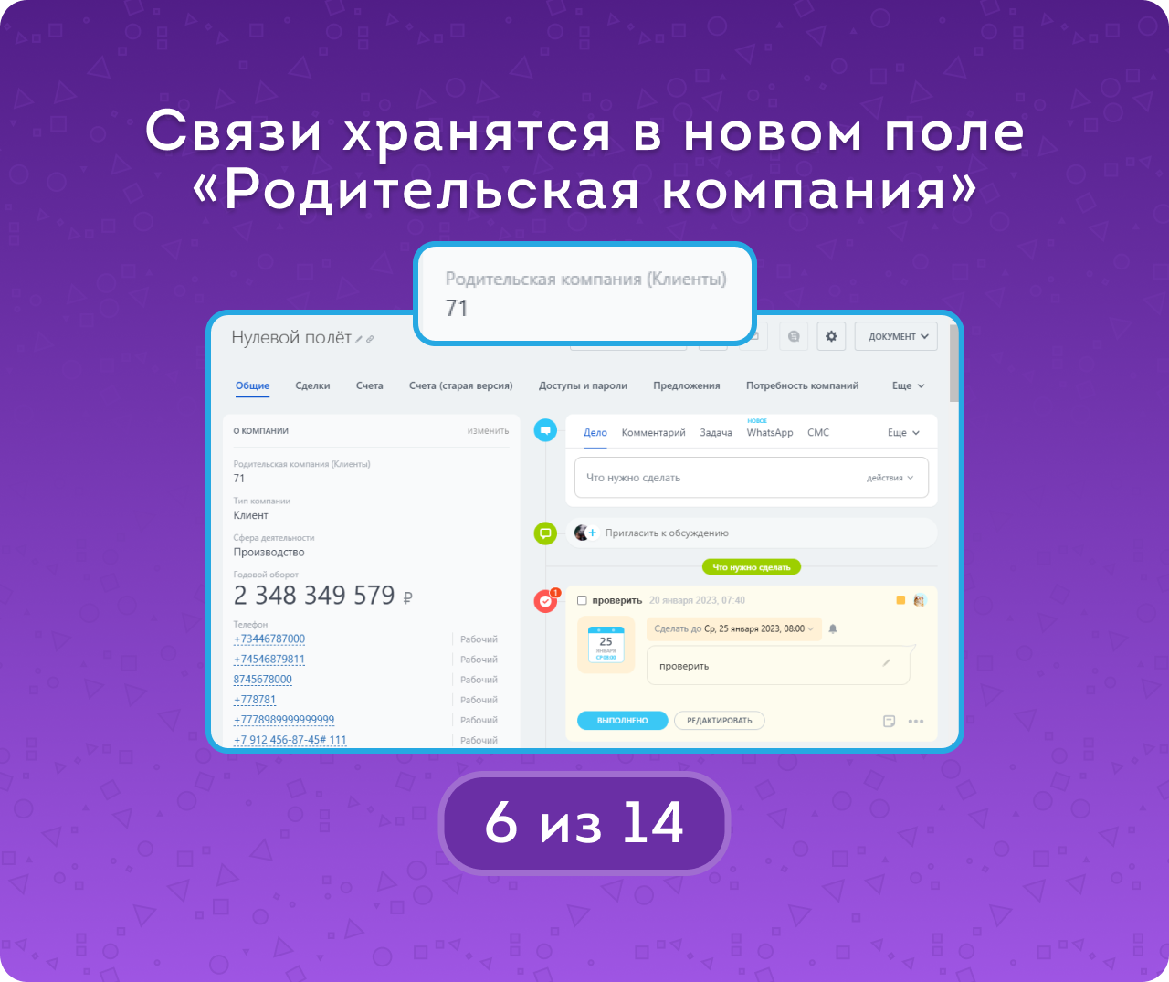 — Создавать холдинги с указанием головной и дочерних организаций. Связь сохраняется в пользовательском поле «Родительская компания (Клиенты)», которое создается автоматически в карточке компании.