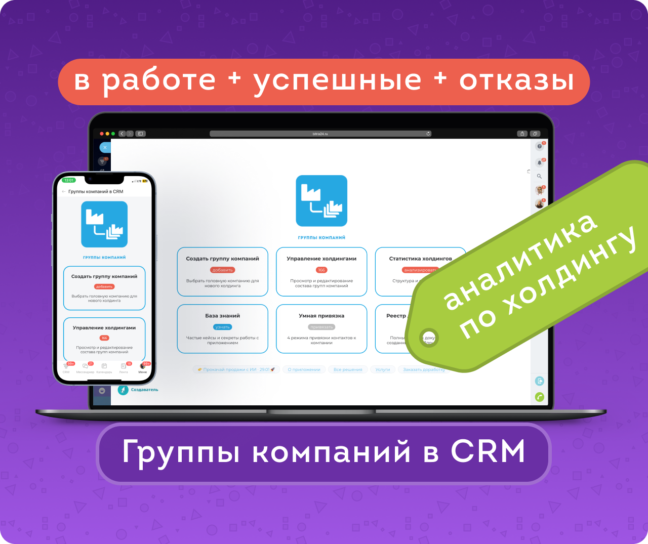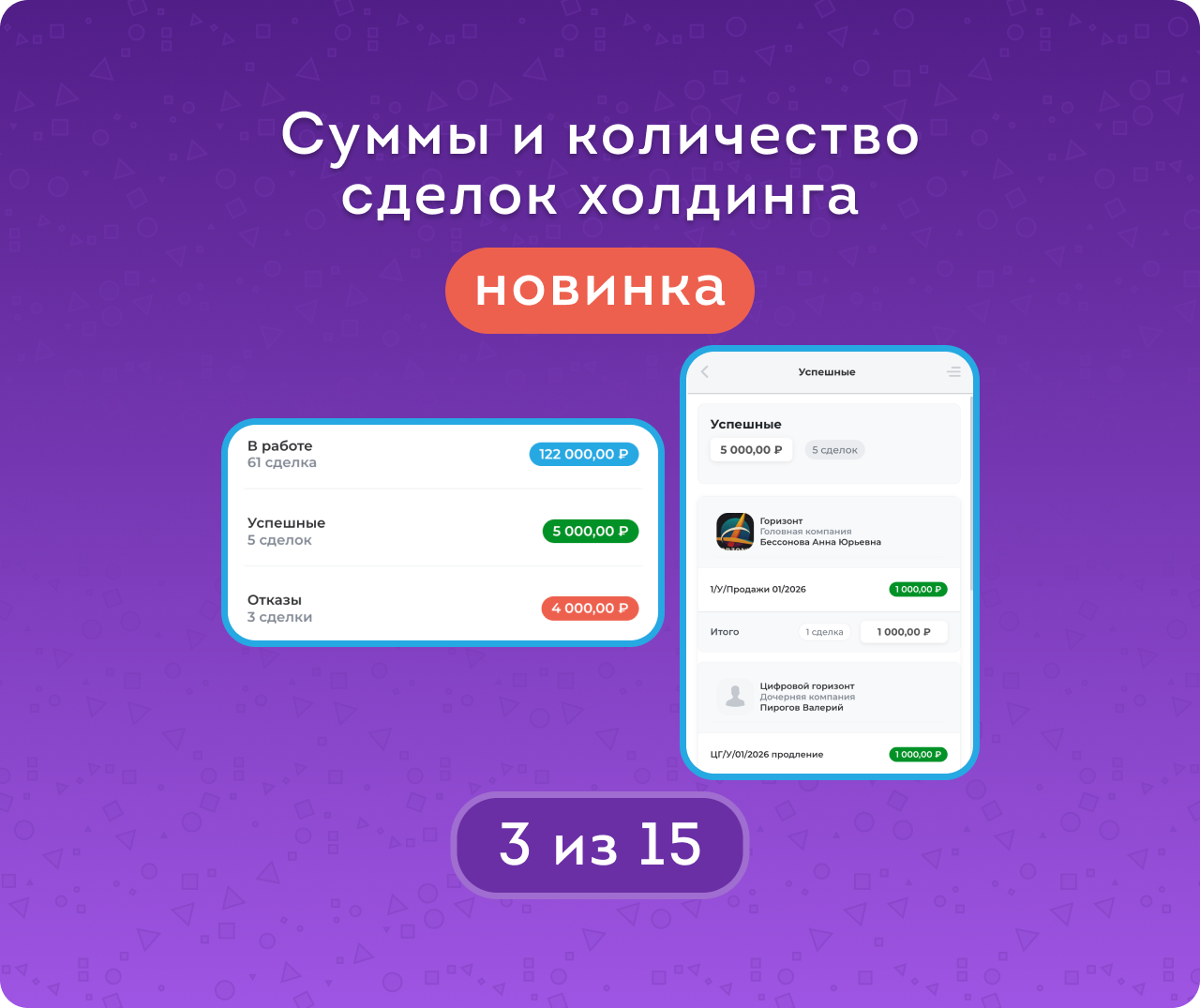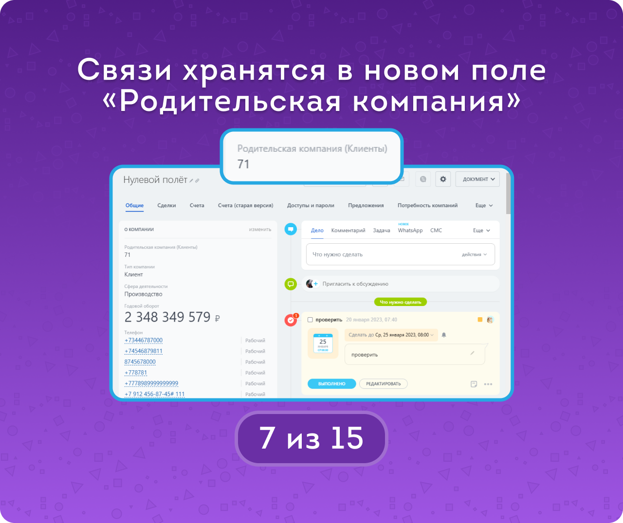 Статистика холдингов — новый режим просмотра полной структуры холдинга (включая контакты) и сумм сделок: в работе, успешные и отказные. При клике на сумму открывается детализация: количество сделок, их названия и прямые ссылки.