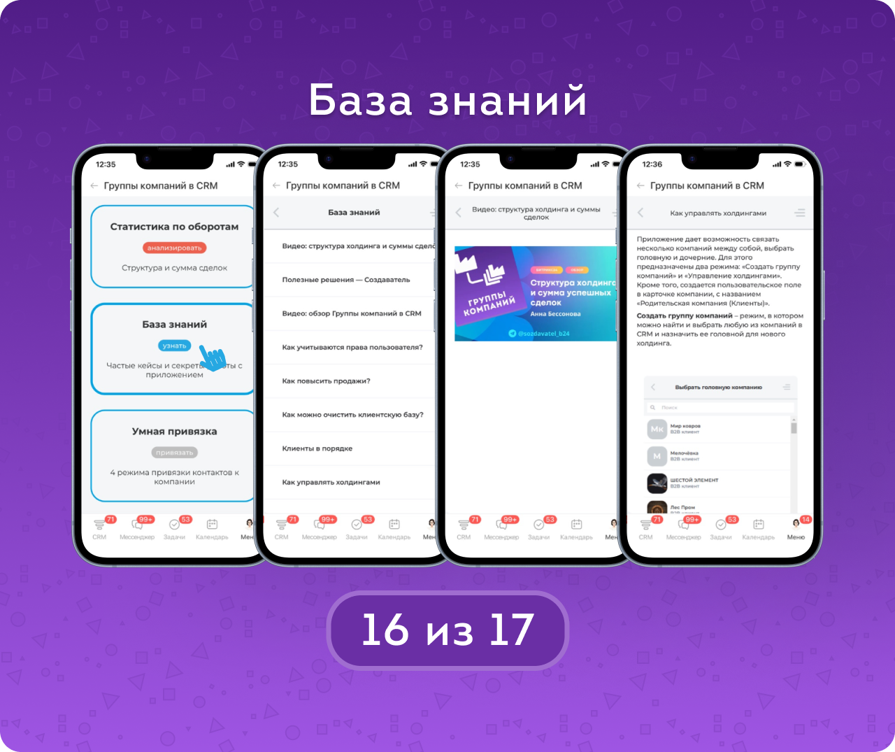 Для того, чтобы пользователю было удобно ориентироваться в приложении — предусмотрена База знаний. В ней находятся ответы на часто задаваемые вопросы, полезные видео и ссылки на помогающие приложения.