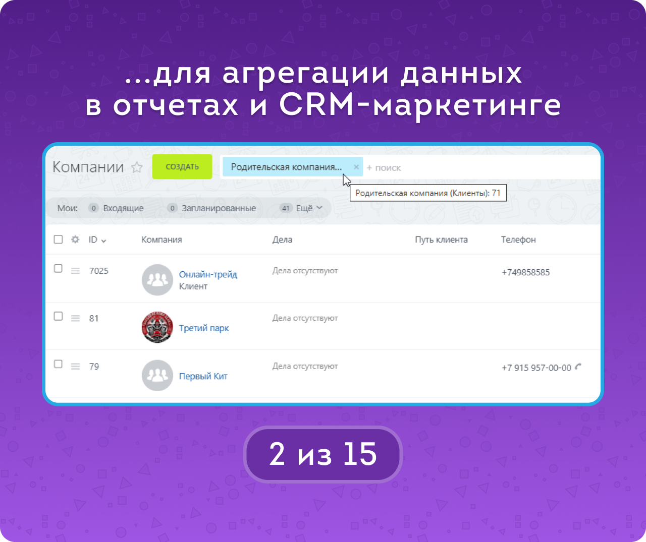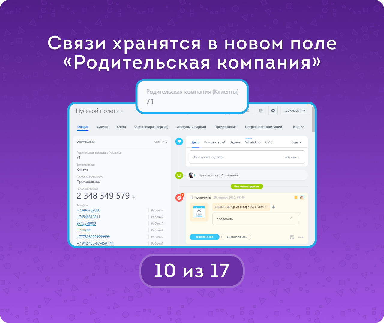 — Создавать холдинги с указанием головной и дочерних организаций. Связь сохраняется в пользовательском поле «Родительская компания (Клиенты)», которое создается автоматически в карточке компании.