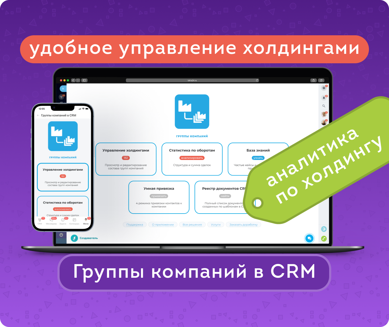 Группы компаний в CRM – инструмент для создания и управления холдингами в CRM Битрикс24. Является частью методологии «Клиенты в порядке» и помогает выстроить прозрачную и понятную структуру работы с взаимосвязанными компаниями.