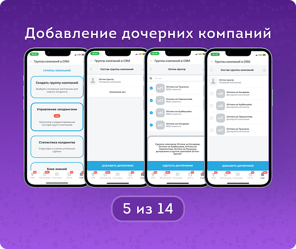 Управление холдингами – режим для назначения (или исключения) дочерних компаний. Компании можно добавлять как по одной, так и несколько сразу. При этом в карточке компании заполняется поле «Родительская компания (Клиенты)» с id головной компании.