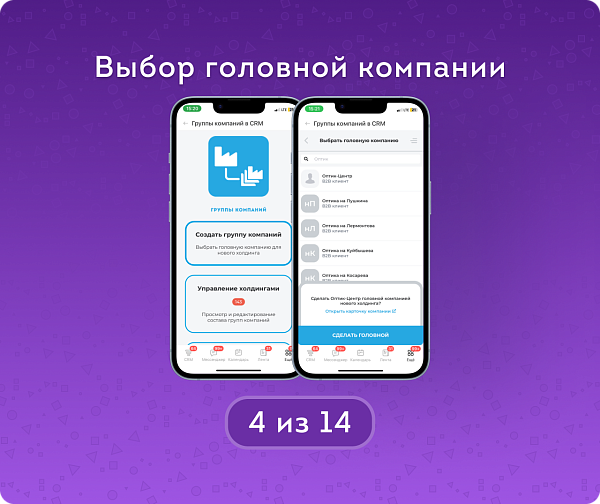 Создать группу компаний – режим, в котором можно найти и выбрать любую из компаний в CRM и назначить ее головной для нового холдинга.