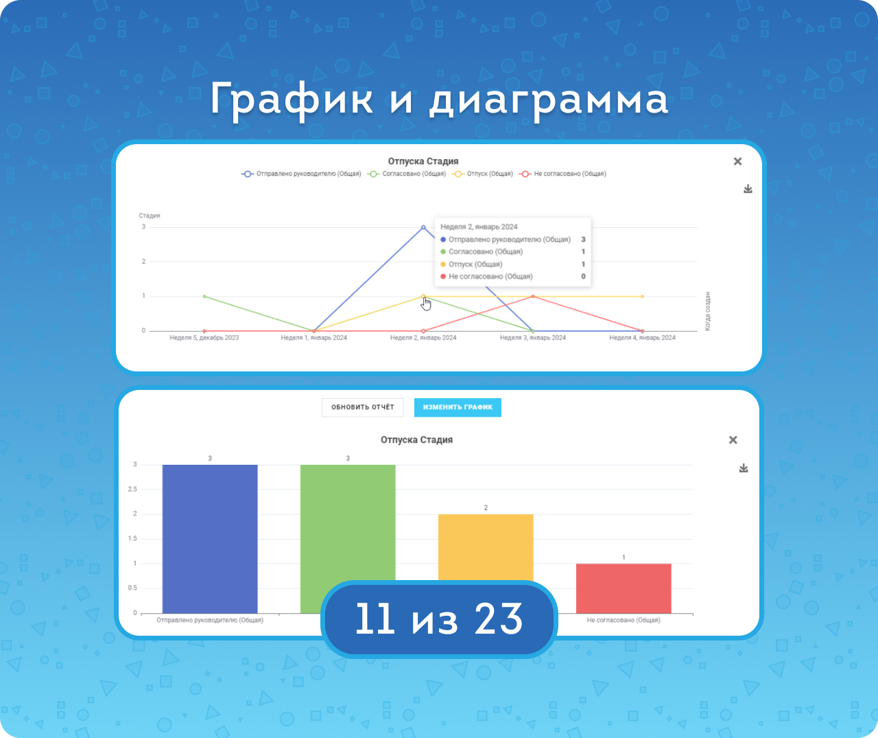 Вы можете построить отчет по смарт-процессу, не связанному с CRM. Он может как быть частью Цифрового рабочего места, так и являться чем-то совершенно отдельным. Например, если вы ведете учёт отпусков в рамках смарт-процессов, то вам будет полезен отчет, сколько заявлений на отпуск уже было согласовано в этом месяце.