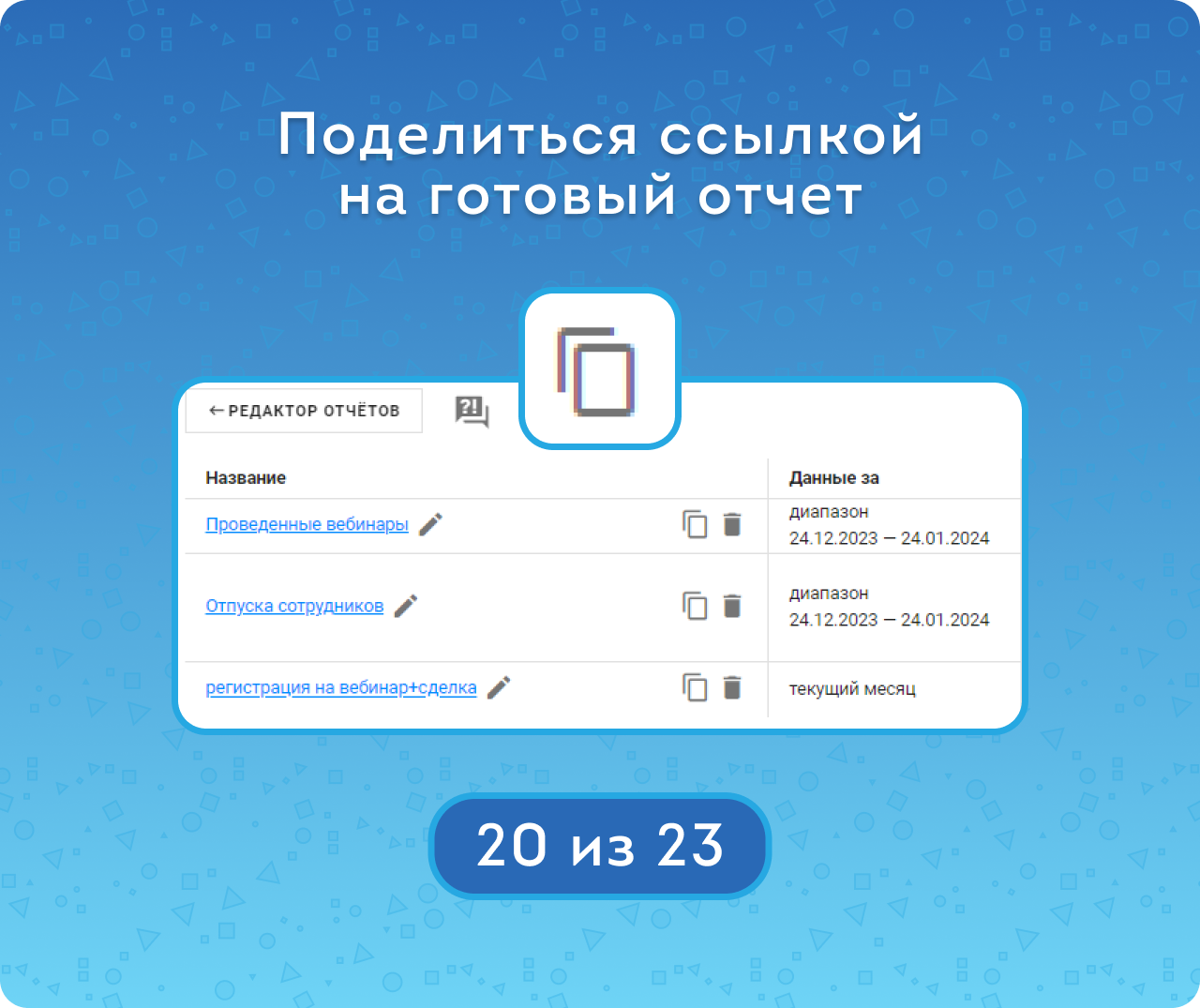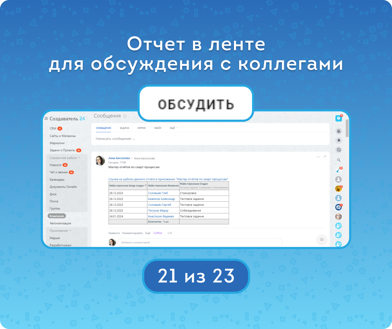 — Настраивать отчеты для регулярной публикации в Ленту Новостей.