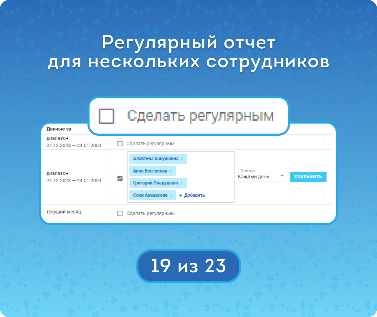 Кроме того, шаблон можно сделать регулярным для публикации в ленту Новостей. Администратор выбирает: какой шаблон будет публиковаться, кто будет его получать и с какой периодичностью. А руководитель регулярно получает нужную ему сводку информации. Почитать про особенности и настройки регулярного отчета можно тут.