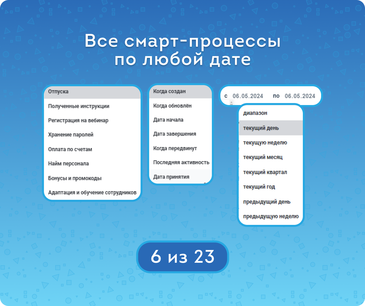 — Менять дату, по который происходит выборка данных. Например, выбирать элементы смарт-процессов по Дате обновления (а не только по Дате создания).