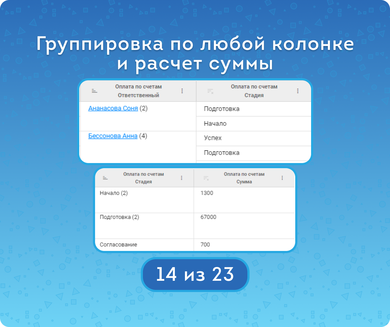 — Используя группировку, видеть промежуточные итоги помимо общих. Например, сколько элементов смарт-процесса в каждой стадии. А также группировать по временным периодам — дням, неделям, месяцам, кварталам или годам.