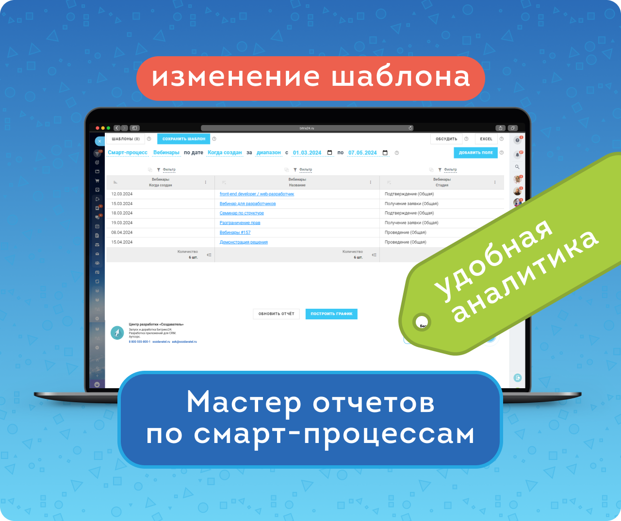 «Мастер отчётов по смарт-процессам» — удобное приложение с расширенными возможностями для анализа. Является логическим продолжением решения Мастер отчетов CRM, и полностью сохраняет его широкий функционал.