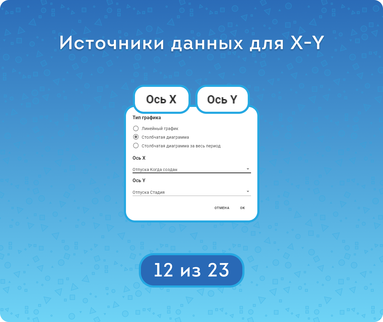 Для того, чтобы выделить в вашем отчете самое важное — используйте графики. Так воспринимать информацию станет проще. Кнопка «Построить график» находится под таблицей, можно выбрать тип графика и подходящие поля для осей Икс (любая дата) и Игрек (числовые и списочные поля).