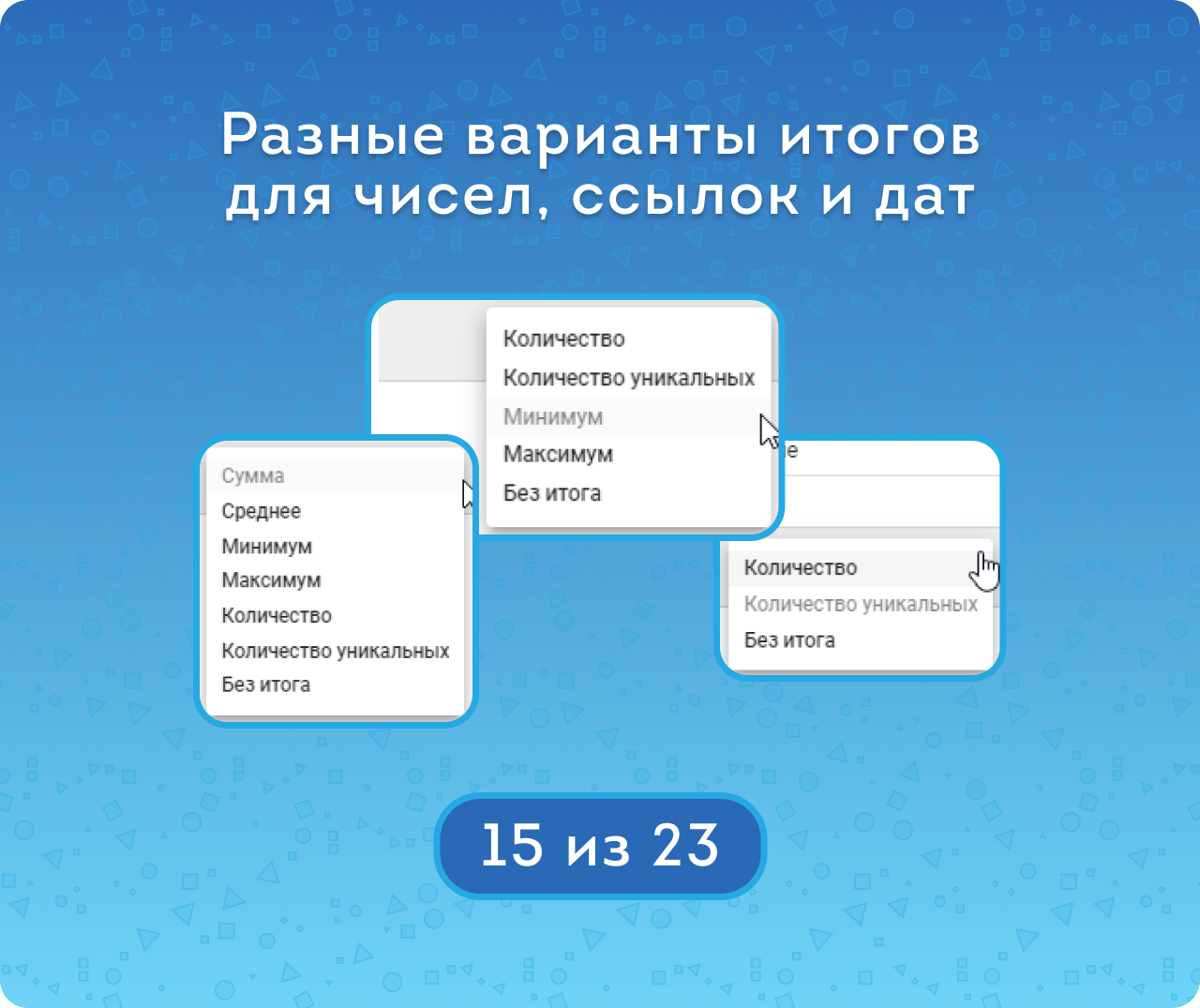 — Подбирать вариант итогов в зависимости от типа поля: Сумма, Минимум, Максимум, Среднее, Количество, Количество уникальных.