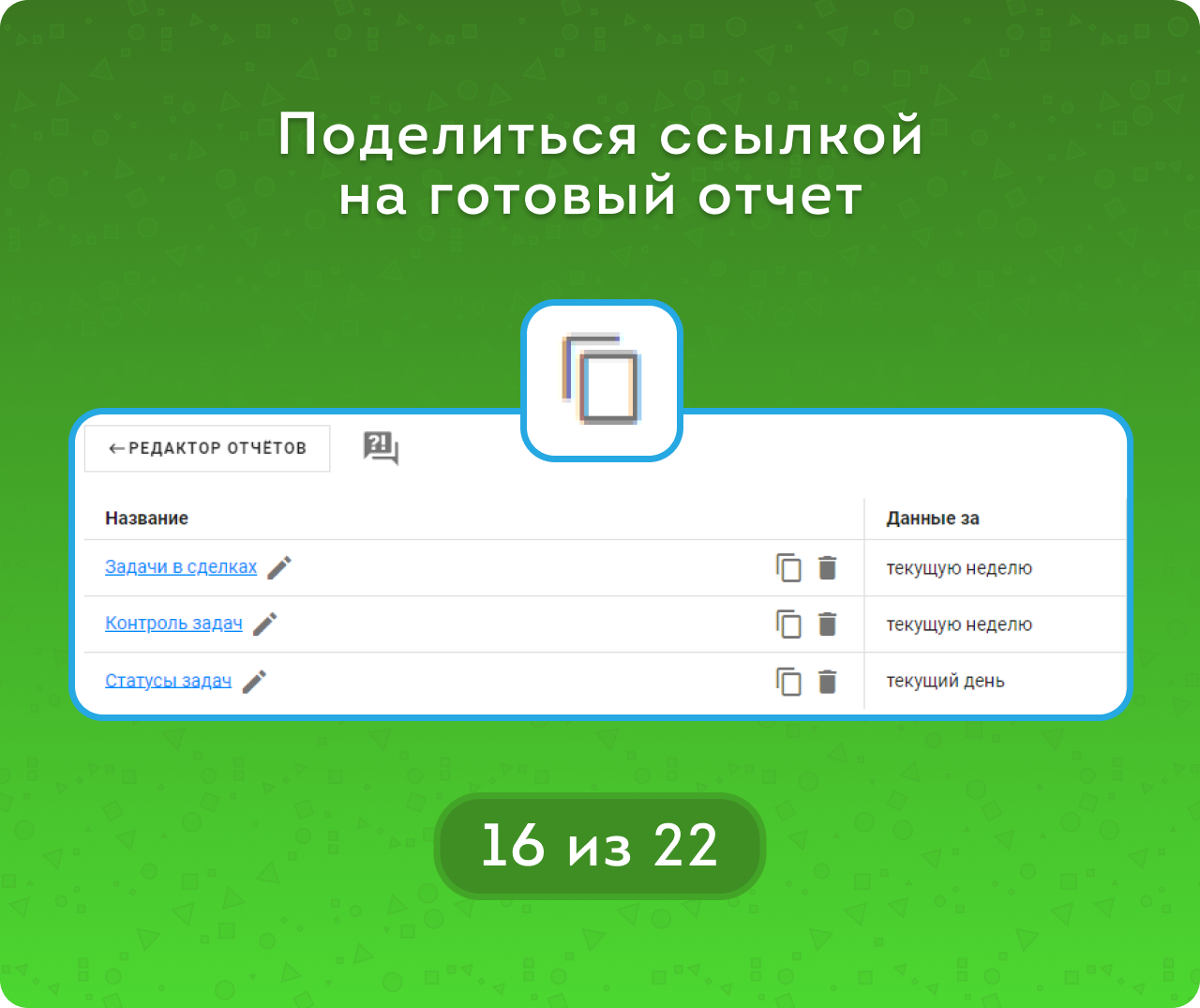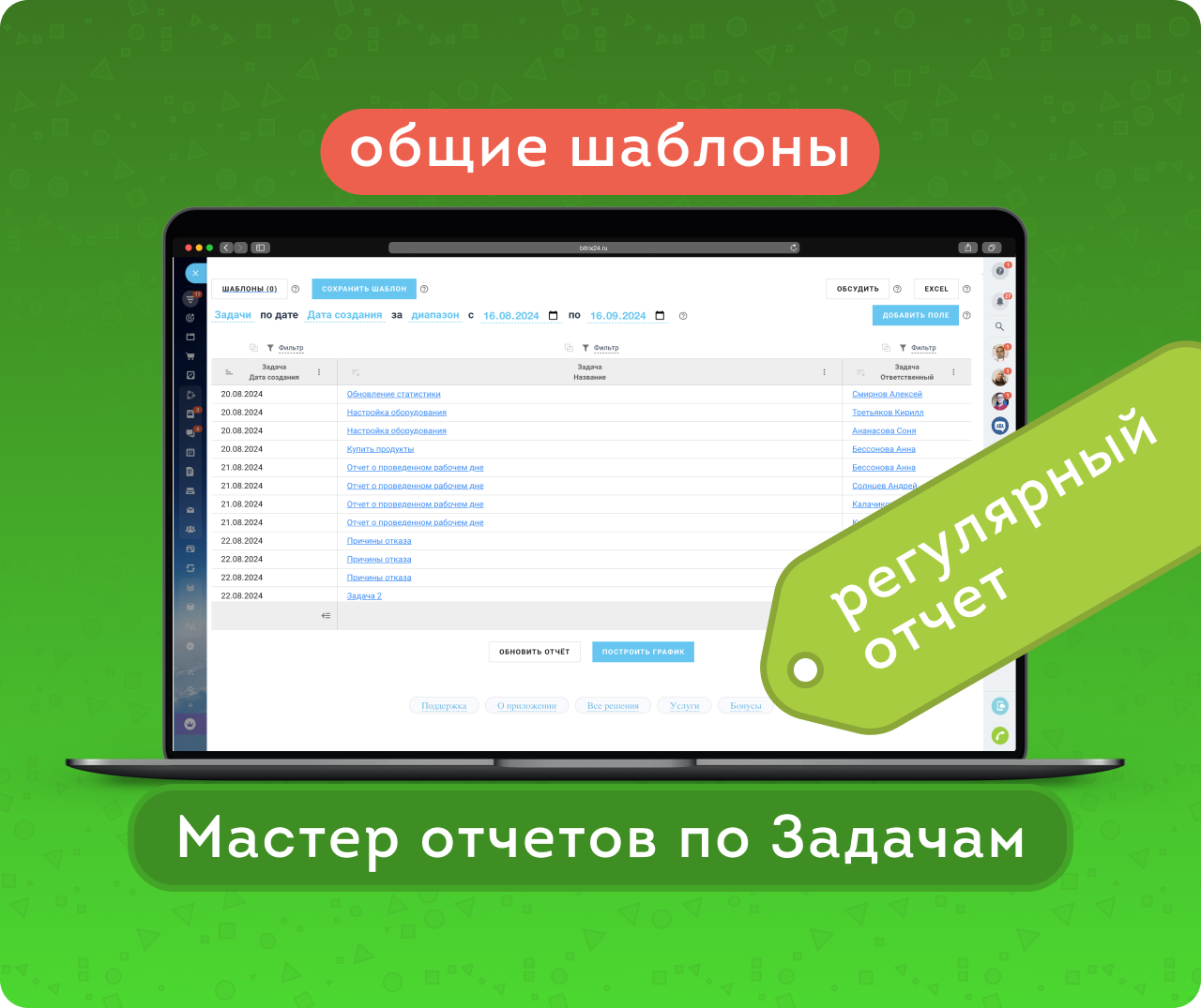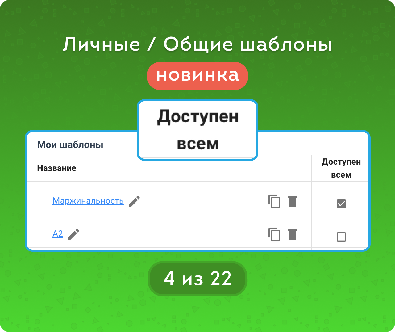 Любой отчет можно сохранить как шаблон с заданными полями, сортировкой и фильтрами. Шаблон можно сделать публичным — тогда он будет доступен всем сотрудникам портала. При необходимости им легко поделиться по ссылке.