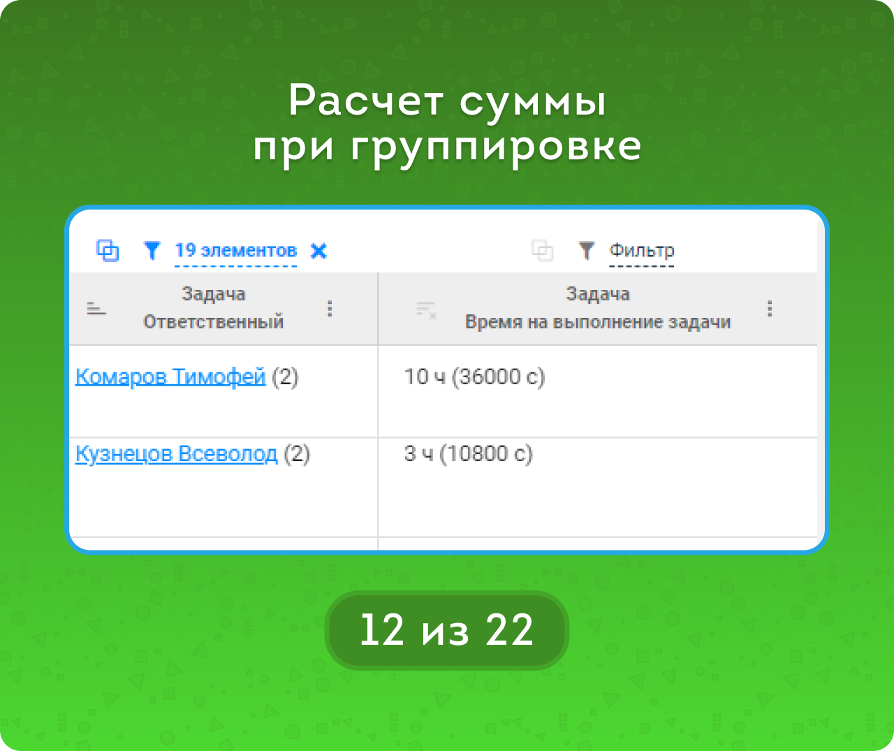 Для того, чтобы проанализировать эффективность команды в разрезе закрытых задач, выберите поля: Название, Ответственный и Статус. Выберите фильтр в поле Статус «Завершена» и примените группировку по Ответственному. Вы увидите, кто из ваших сотрудников закрыл больше всего задач за период.