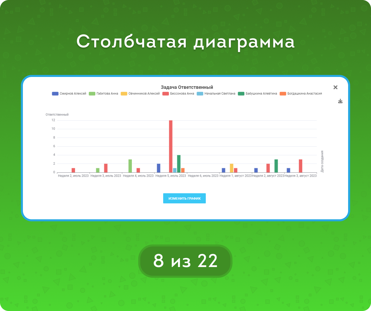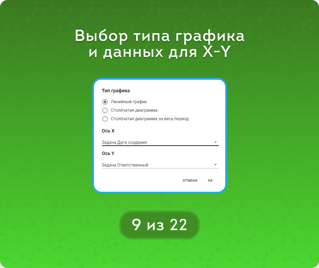 Для того, чтобы выделить в вашем отчете самое важное — используйте графики. Так воспринимать информацию станет проще. Кнопка «Построить график» находится под таблицей, можно выбрать тип графика и подходящие поля для осей Икс (любая дата) и Игрек (числовые и списочные поля).