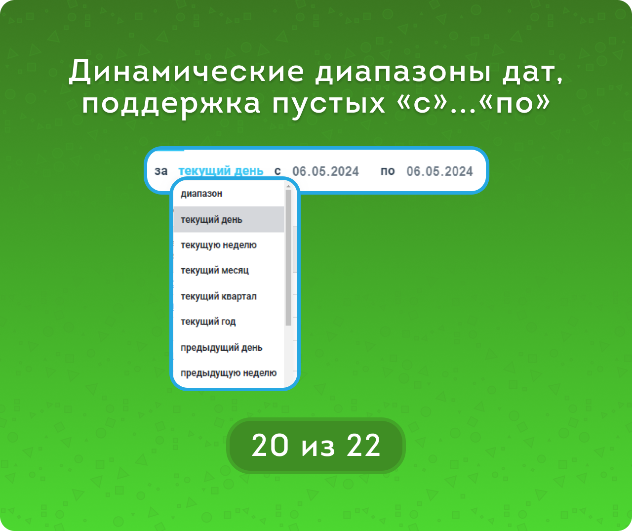 Удобно выбирать данные за диапазон, текущий и предыдущий день/неделю/месяц/квартал/год, а также за последние N дней. А если в диапазоне убрать даты “С” и “По” — можно вывести данные за весь период.