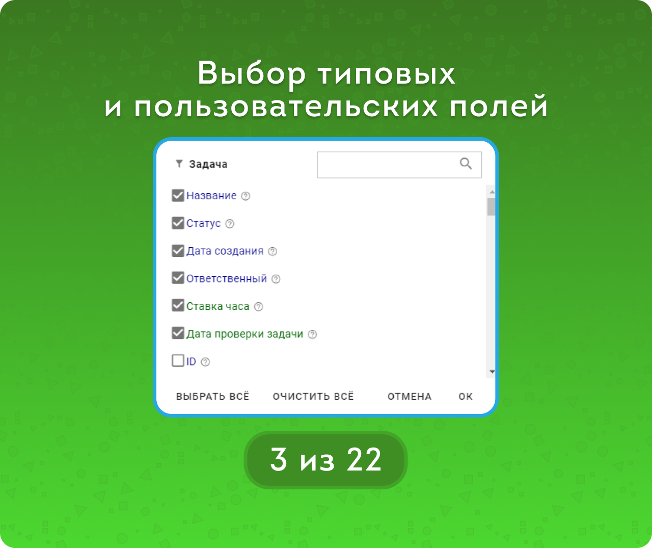 - Выбор полей как по Задачам, так и по связанным с ними сущностям CRM (Сделки, Лиды, Счета). Не только типовых, но и пользовательских.