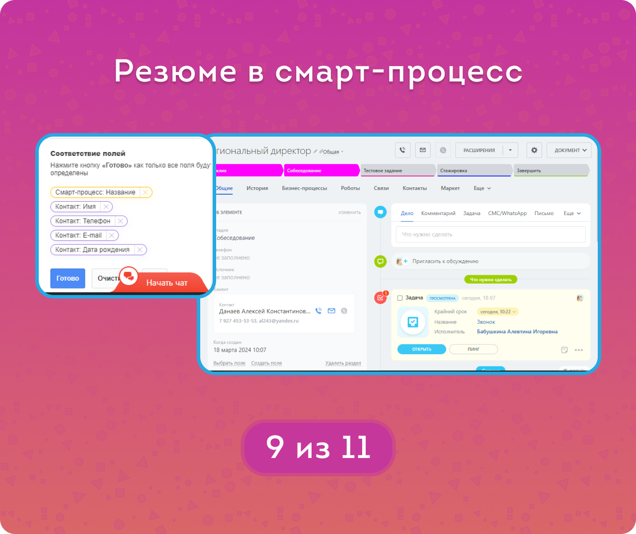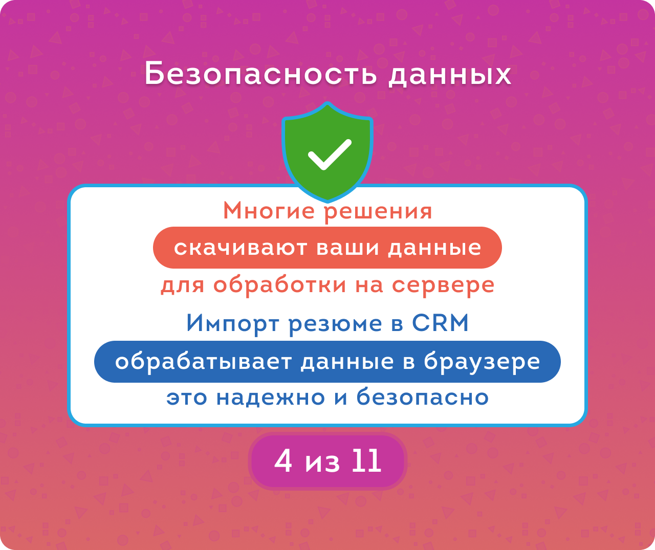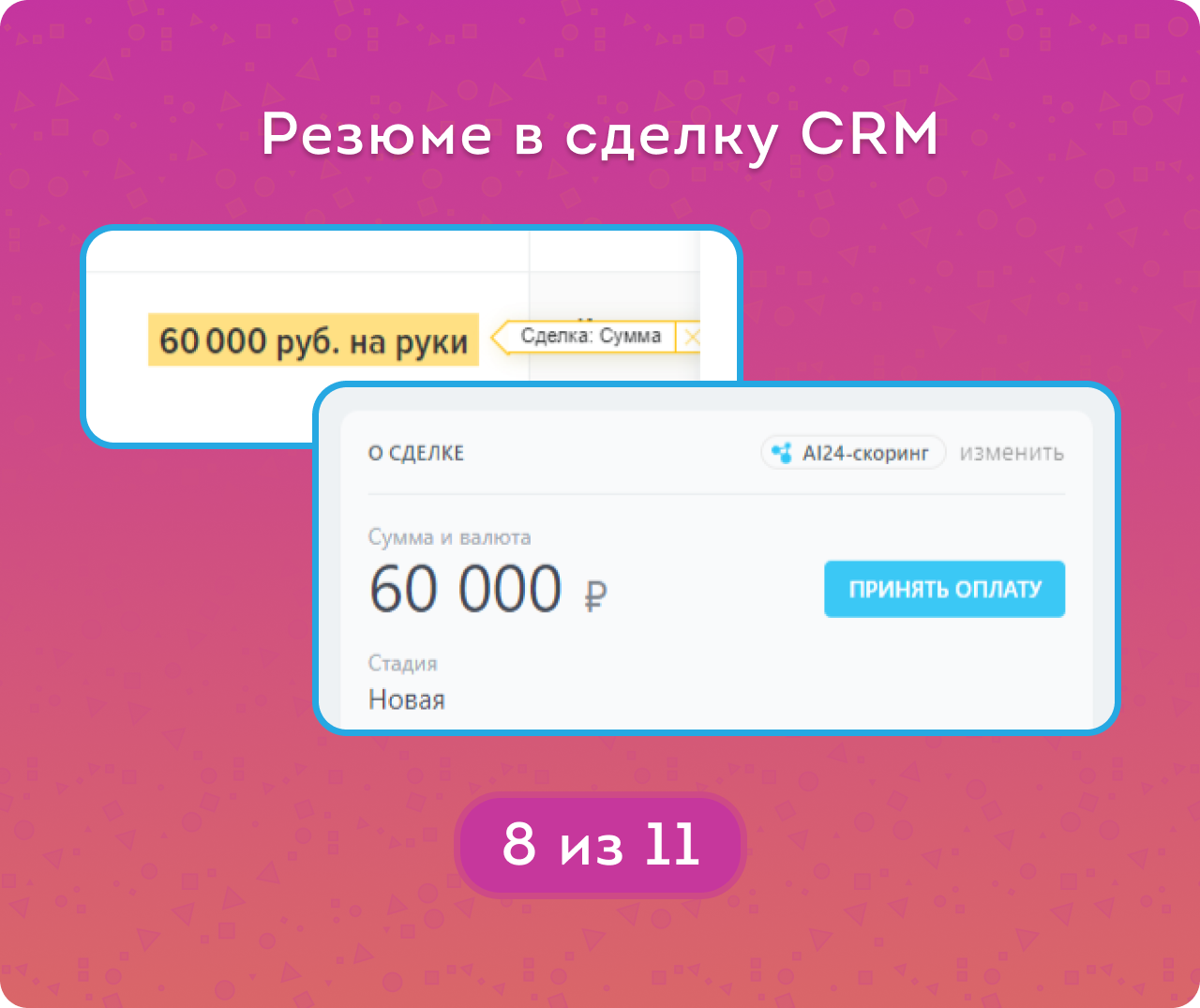 • Сохранять ссылку на резюме кандидата в поле карточки.