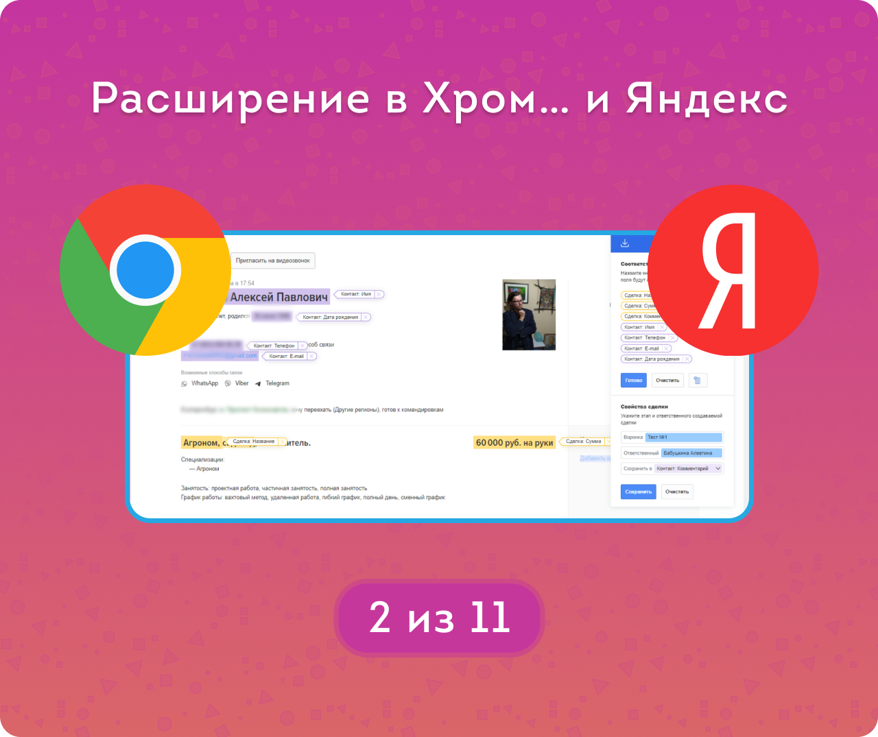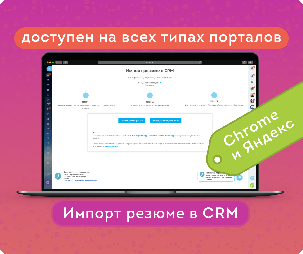 Приложение Импорт резюме в CRM – это расширение для браузеров Google Chrome и Яндекс, которое помогает HR заводить кандидатов с различных источников (HH, Зарплата.ру, SuperJob, Авито, Работа.ру) в Битрикс24.