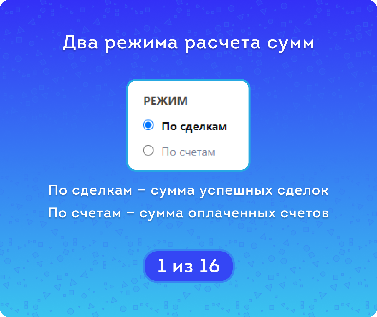 Сменить режим учета можно в настройках приложения. Счета учитываются по полю «Срок оплаты», а Сделки – по полю «Дата завершения».