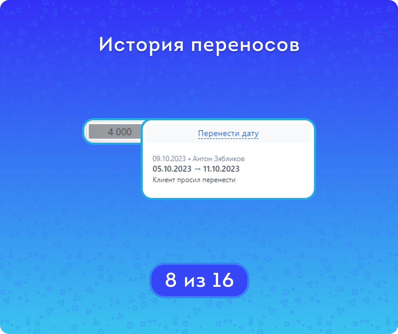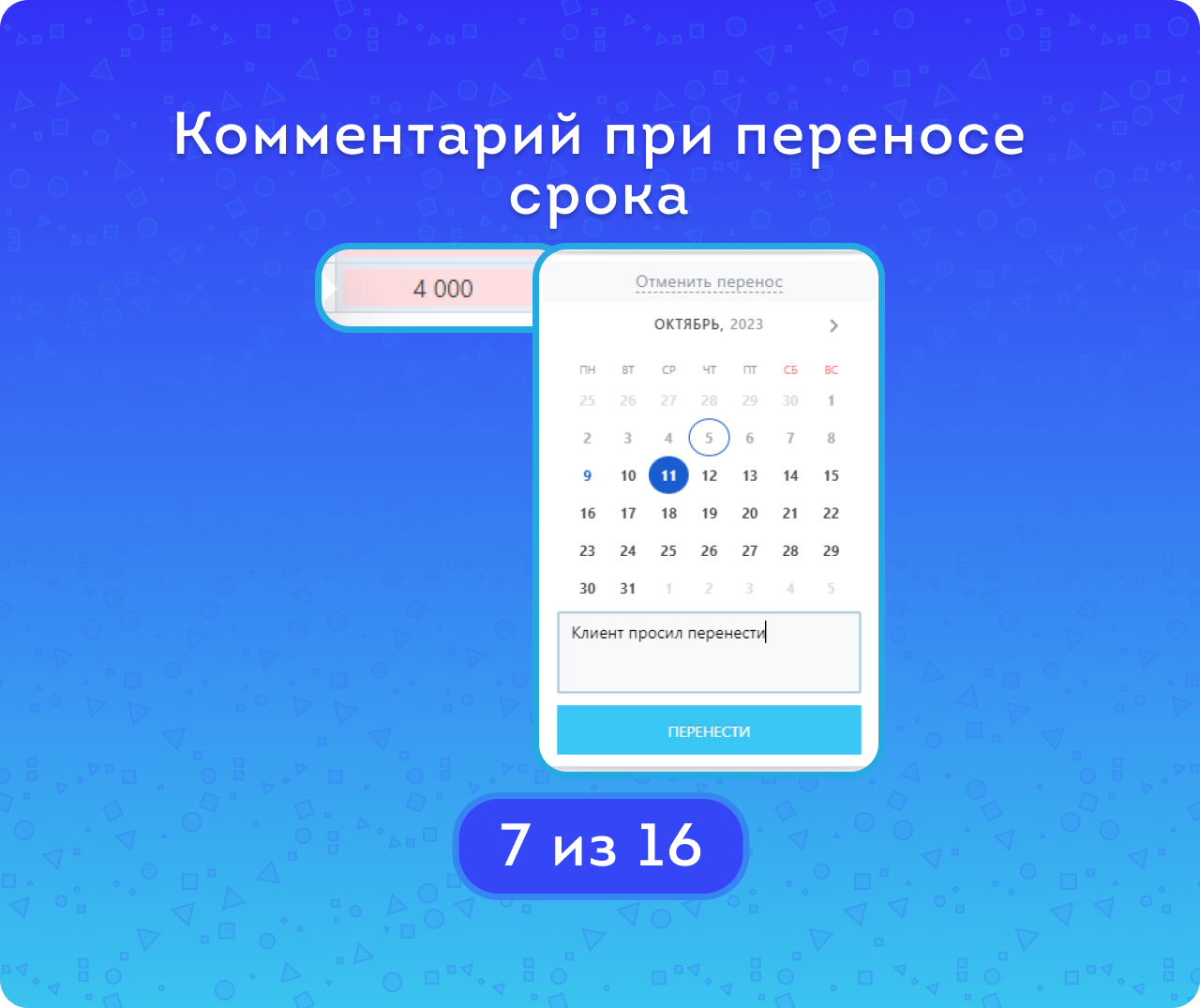 Помимо этого приложение подсчитывает итоги оплат по дням, неделям, месяцам. Кроме этого вы можете увидеть сумму планируемых, ожидаемых и просроченных оплат по каждому менеджеру на текущий день. А также в один клик легко сменить плановый срок оплаты Счета или дату завершения Сделки, с указанием комментария о причине переноса.