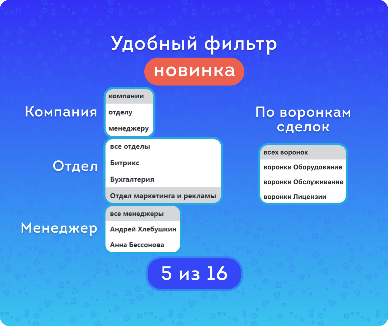 Фильтры по компании, отделам и менеджерам позволят более детально анализировать данные и оптимизировать процессы управлениям продажами. А фильтр по воронкам Сделок (NEW) позволит детализировать оплаты по направлениям.