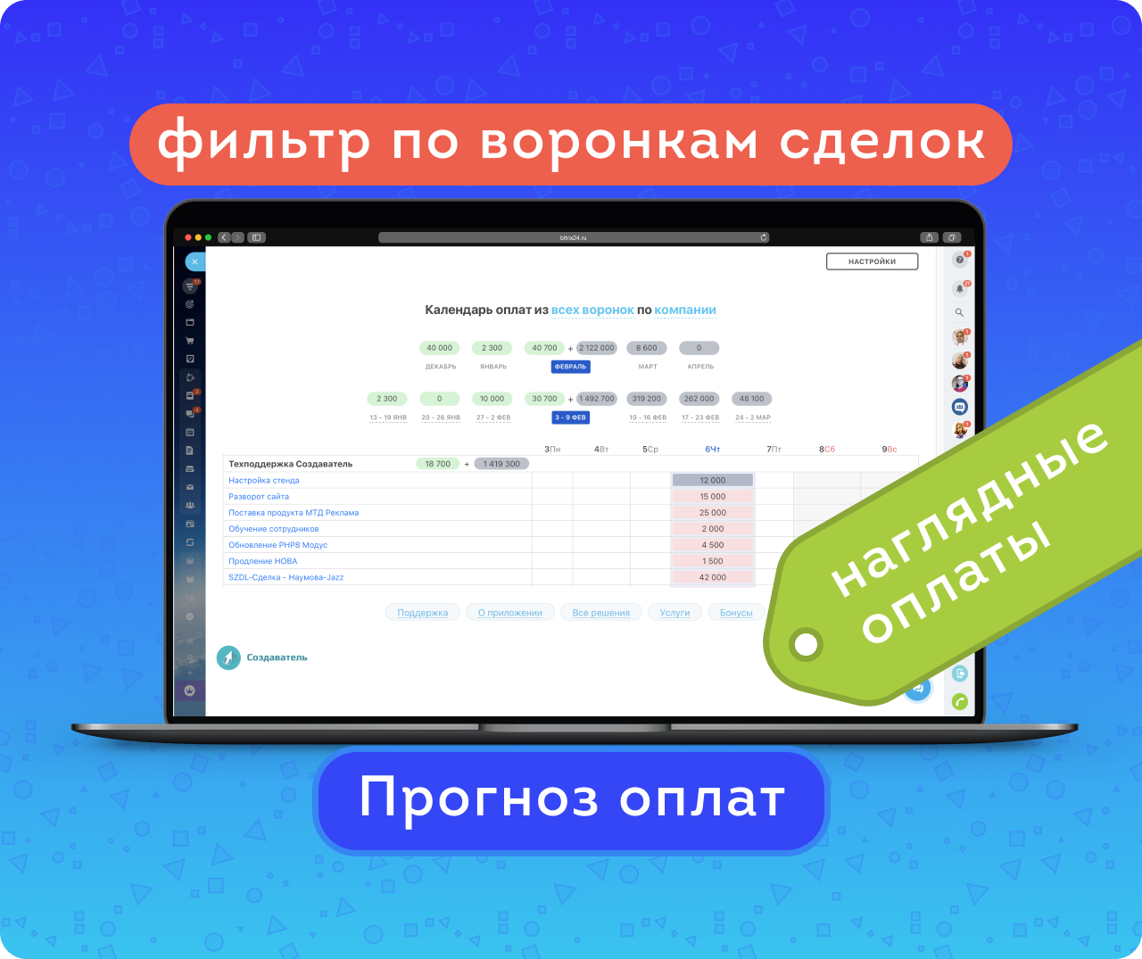 Когда деньги? Прогноз оплат — это ваш надежный инструмент для успешного управления финансами и продажами в Bitrix24! А для анализа Оборота и метрик продаж используйте приложение Формула продаж и ABC-анализ.