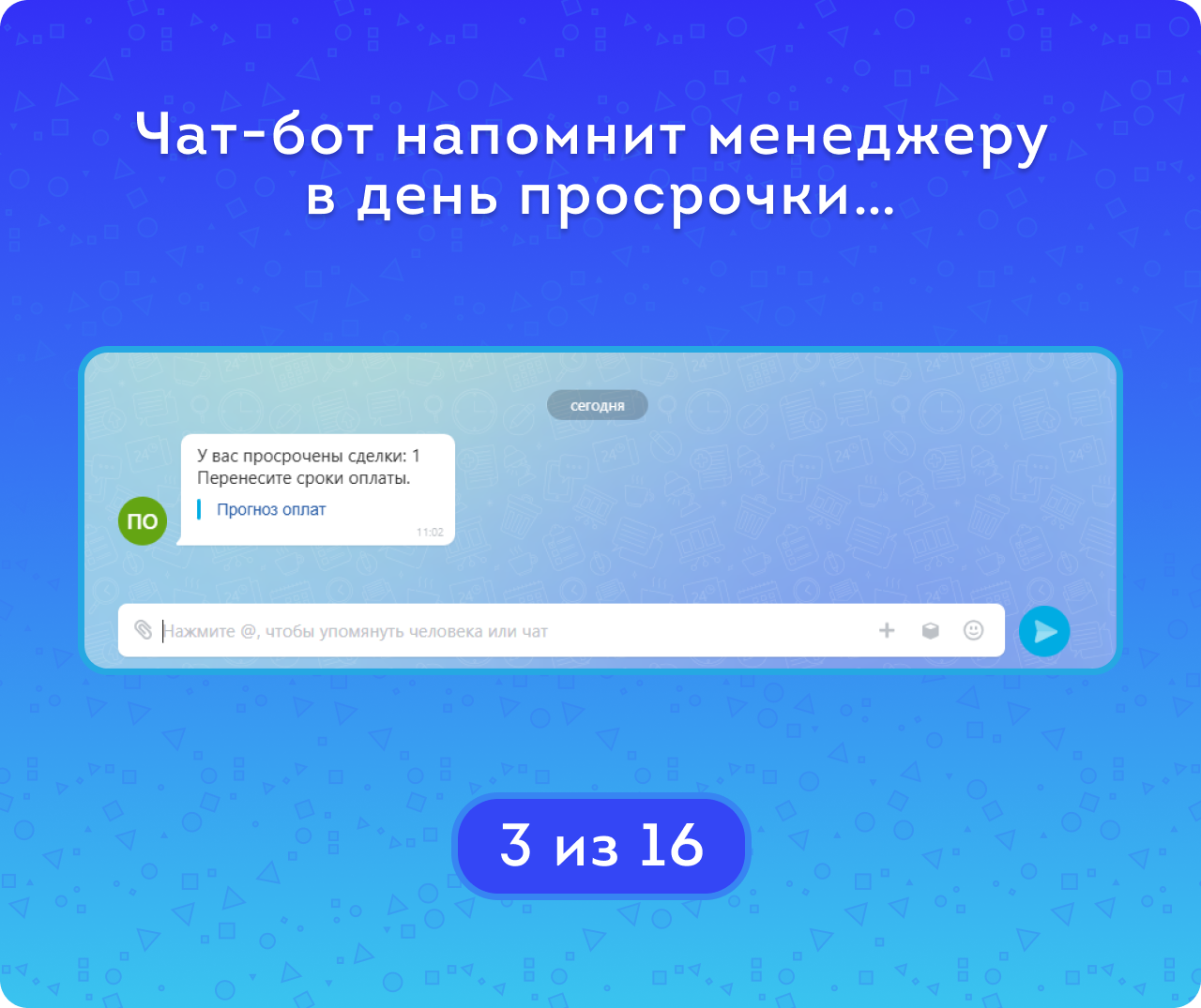 Настройки уведомлений — общие на весь портал, по умолчанию выключены. При включении — чат-бот Прогноз оплат присылает сообщение с количеством просроченных Сделок или Счетов и ссылкой на приложение (для переноса сроков).